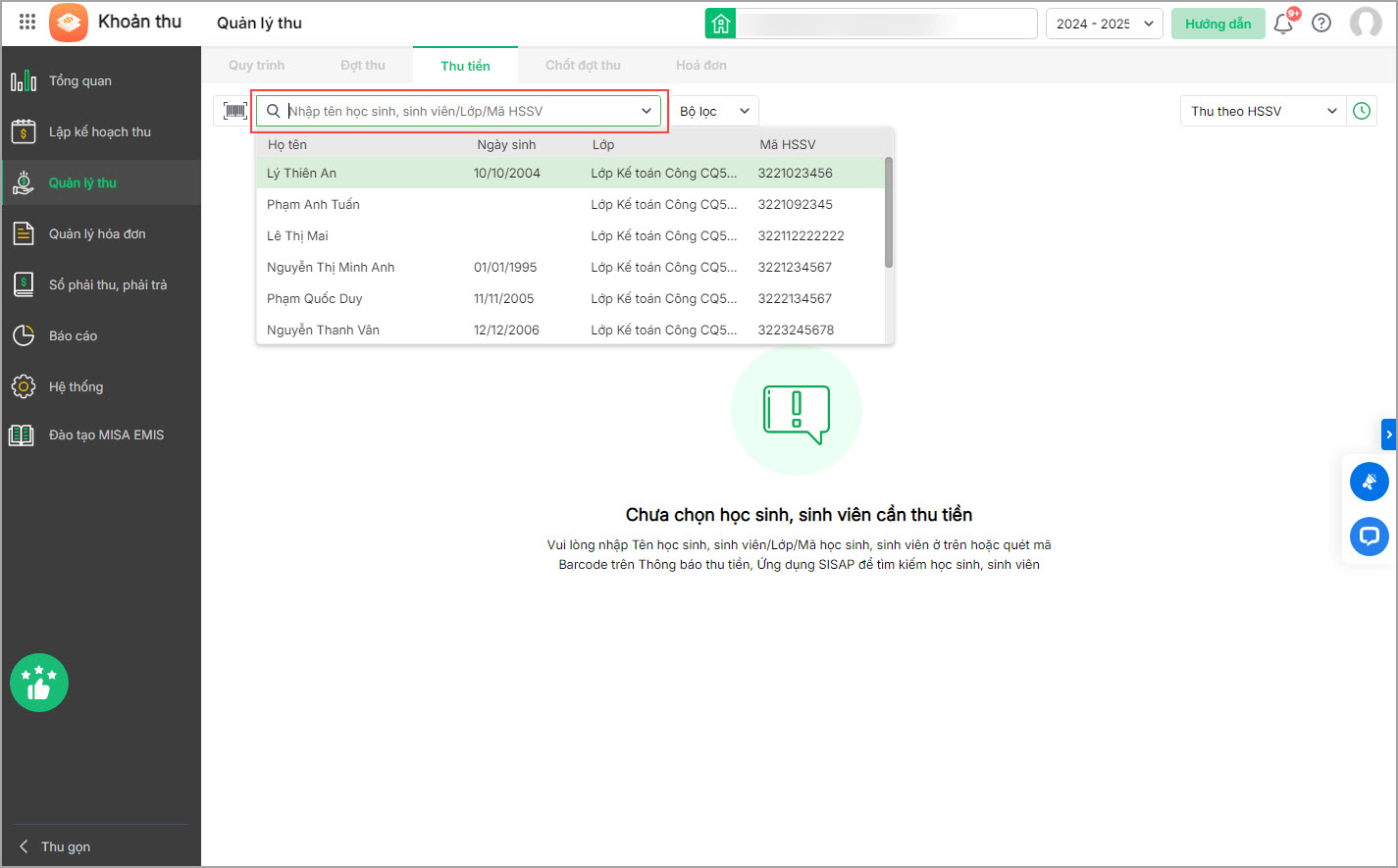 - Nhập Tên, Lớp, Mã SV hoặc quét mã của HS cần thu tiền. Chọn HSSV trong danh sách.