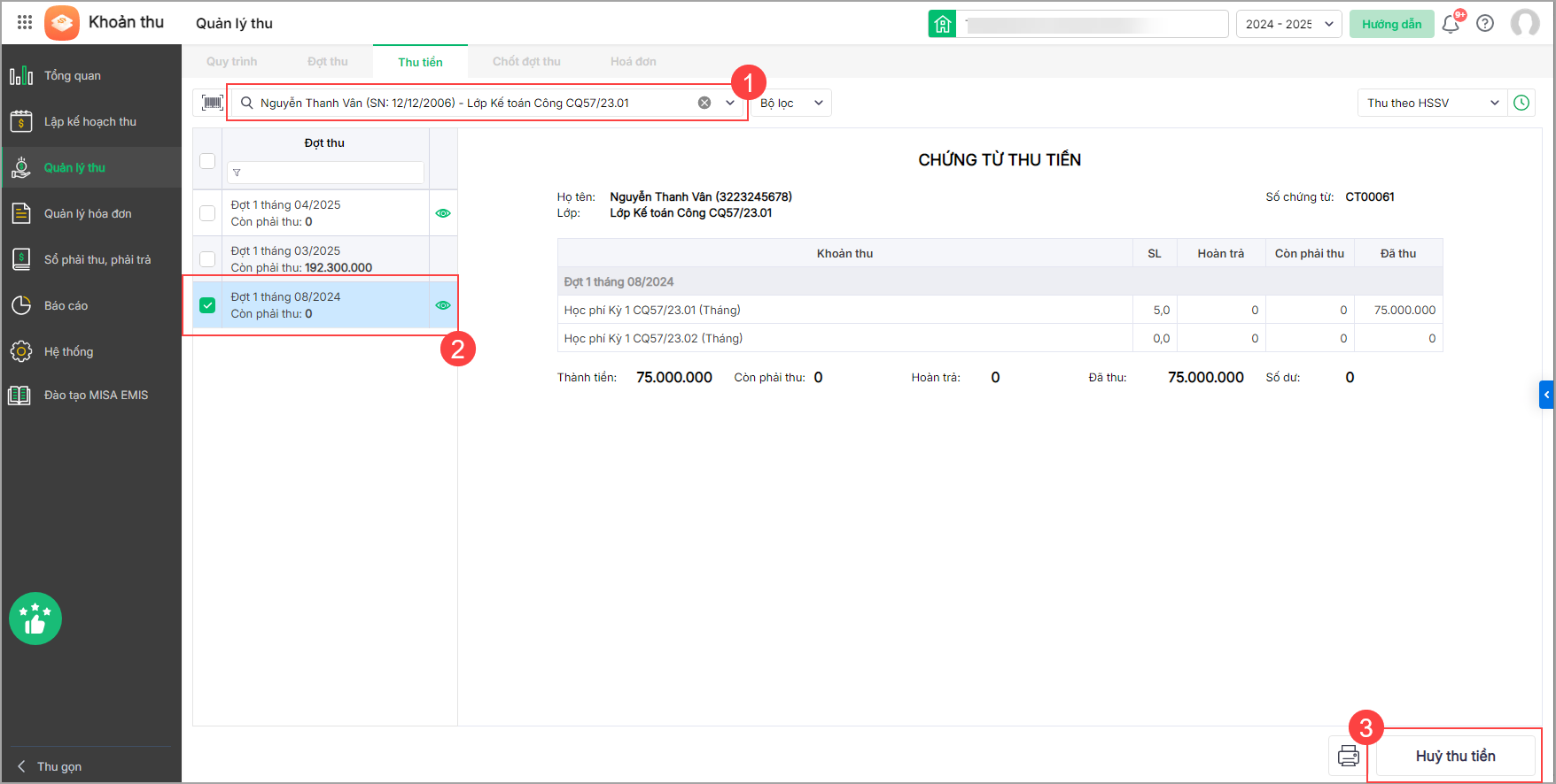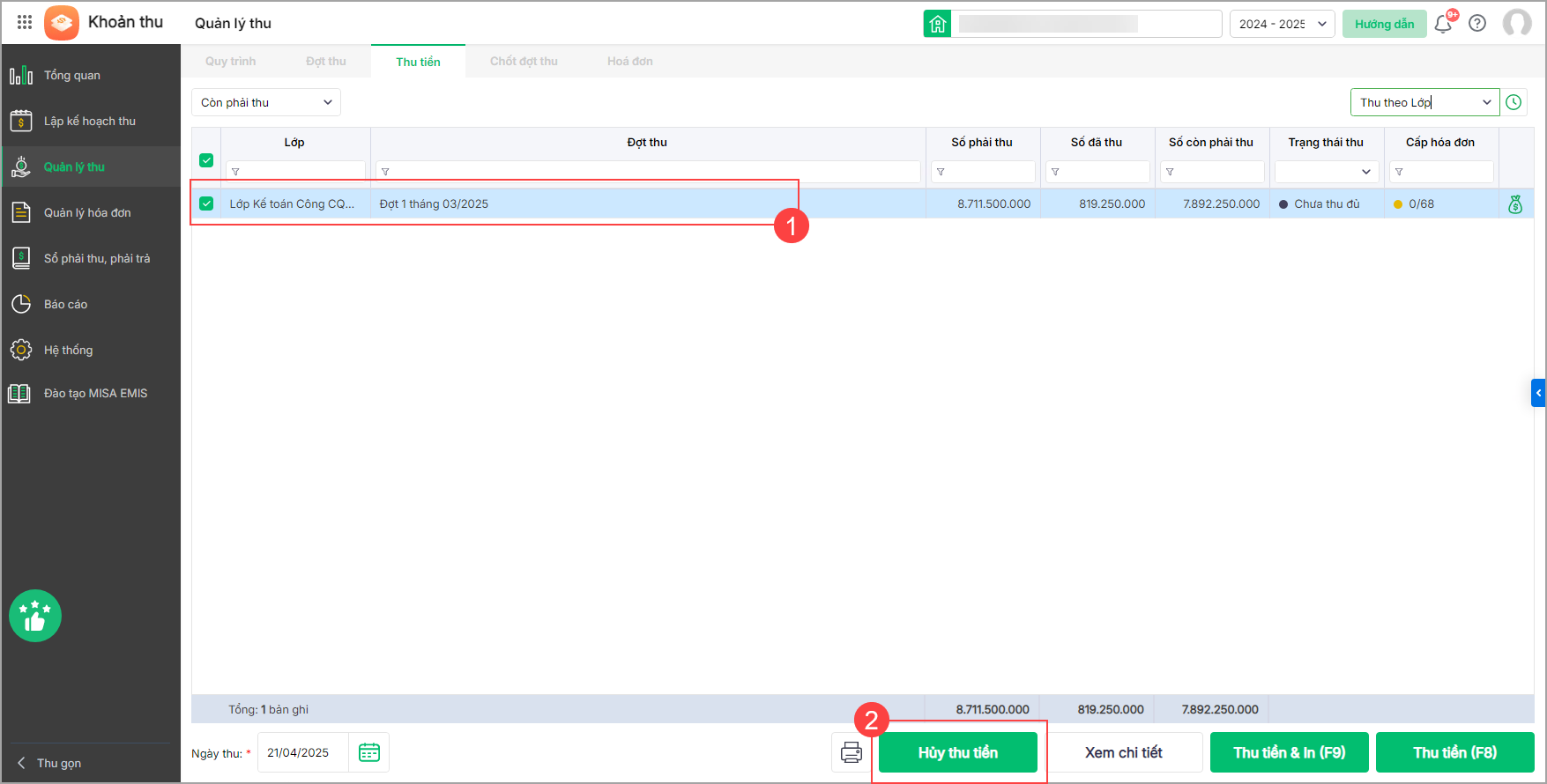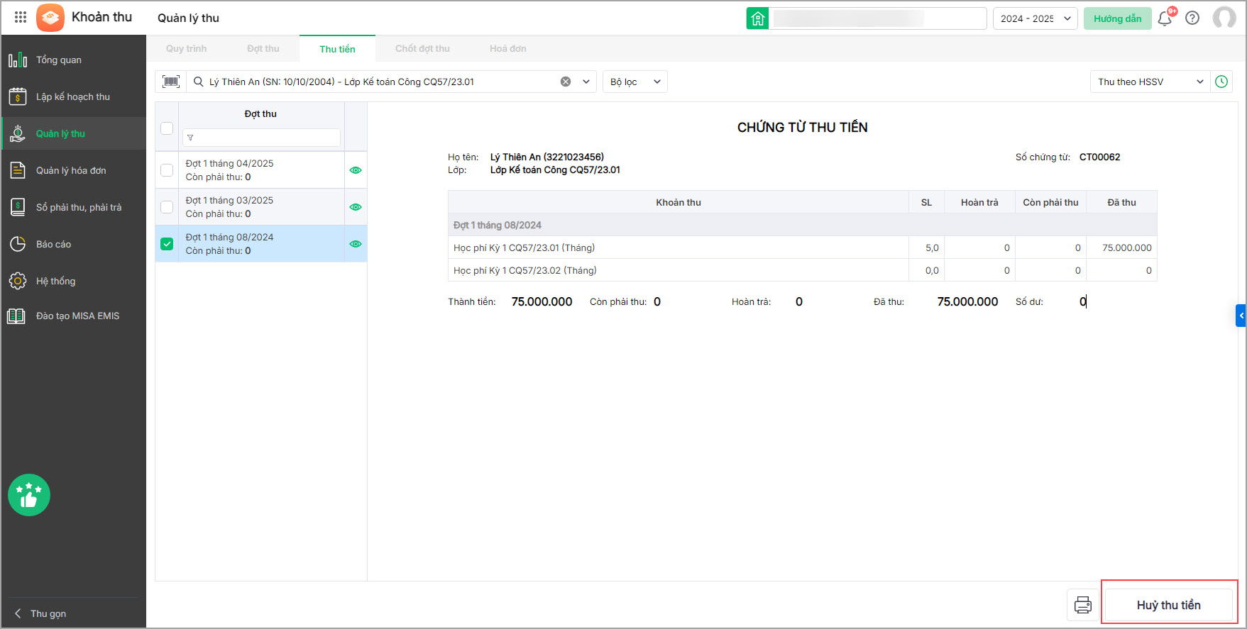 5. Trường hợp xảy ra sai sót và kế toán muốn hủy thu tiền. Anh/chị chọn đợt thu và nhấn Hủy thu tiền.