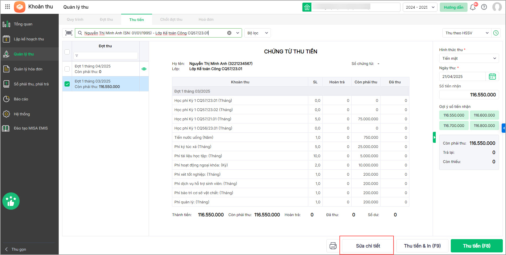 - Trường hợp HSSV có phát sinh thu thừa, thiếu, anh/chị nhấn Sửa chi tiết.