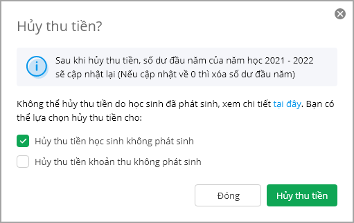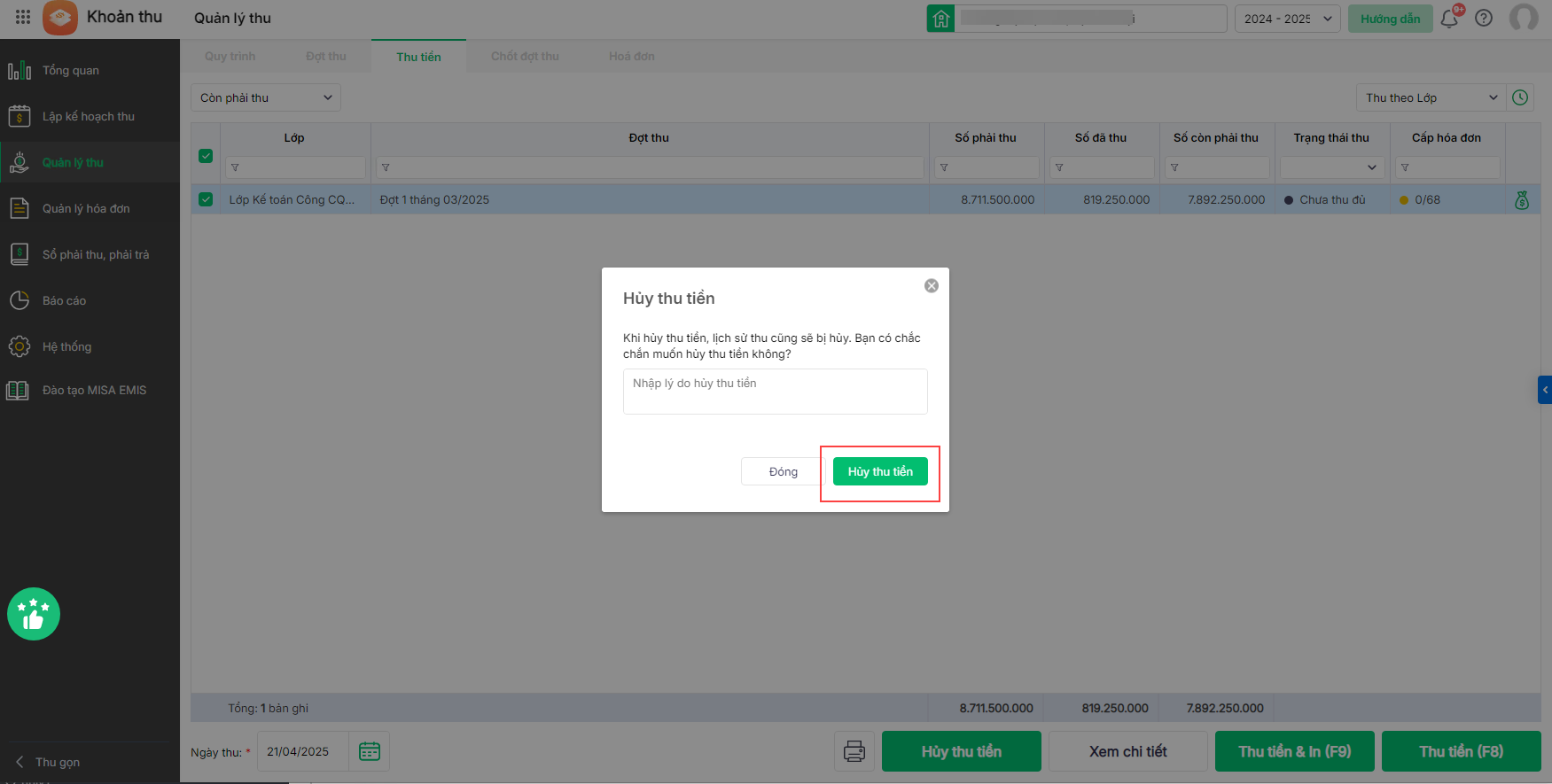 - Tích chọn lớp học của đợt thu cần hủy thu tiền, nhấn Hủy thu tiền.