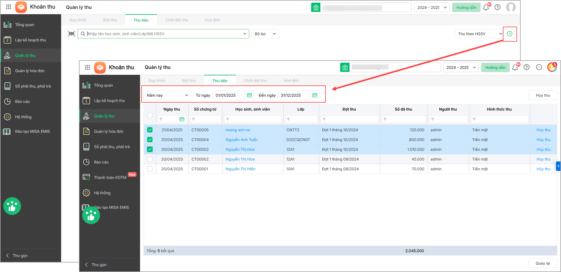 - Nhấn vào biểu tượng bên dưới để chọn thời gian thu tiền và lọc danh sách HSSV đã thu.