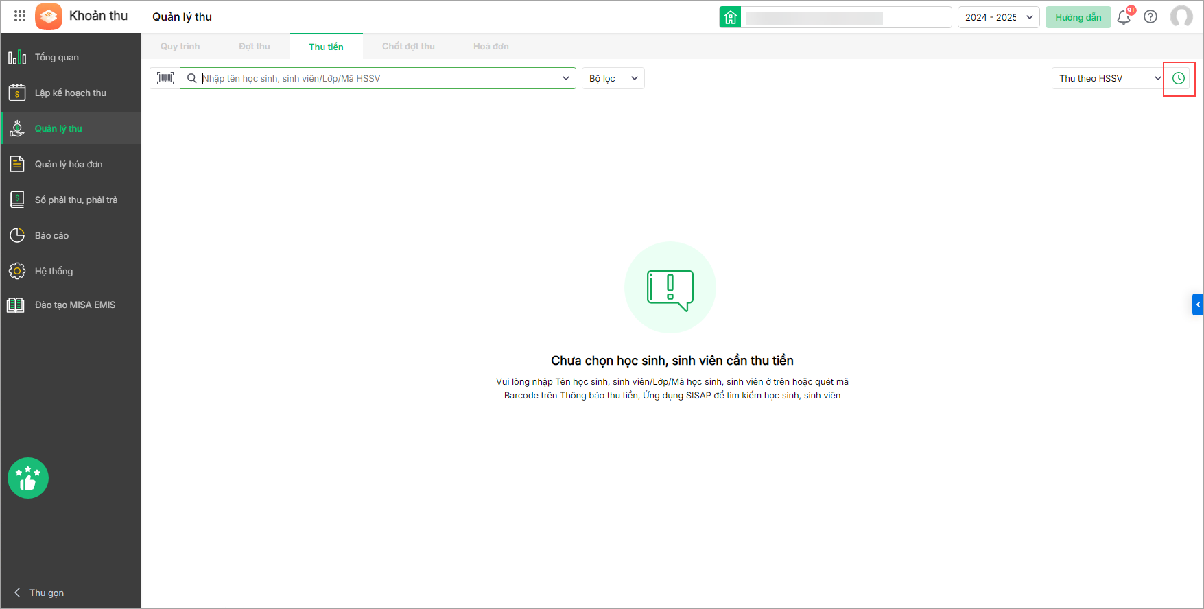 - Nhấn vào biểu tượng đồng hồ bên dưới để xem Lịch sử thu tiền, phần mềm hiển thị lịch sử thu tiền của HSSV theo bộ lọc thời gian đã chọn.