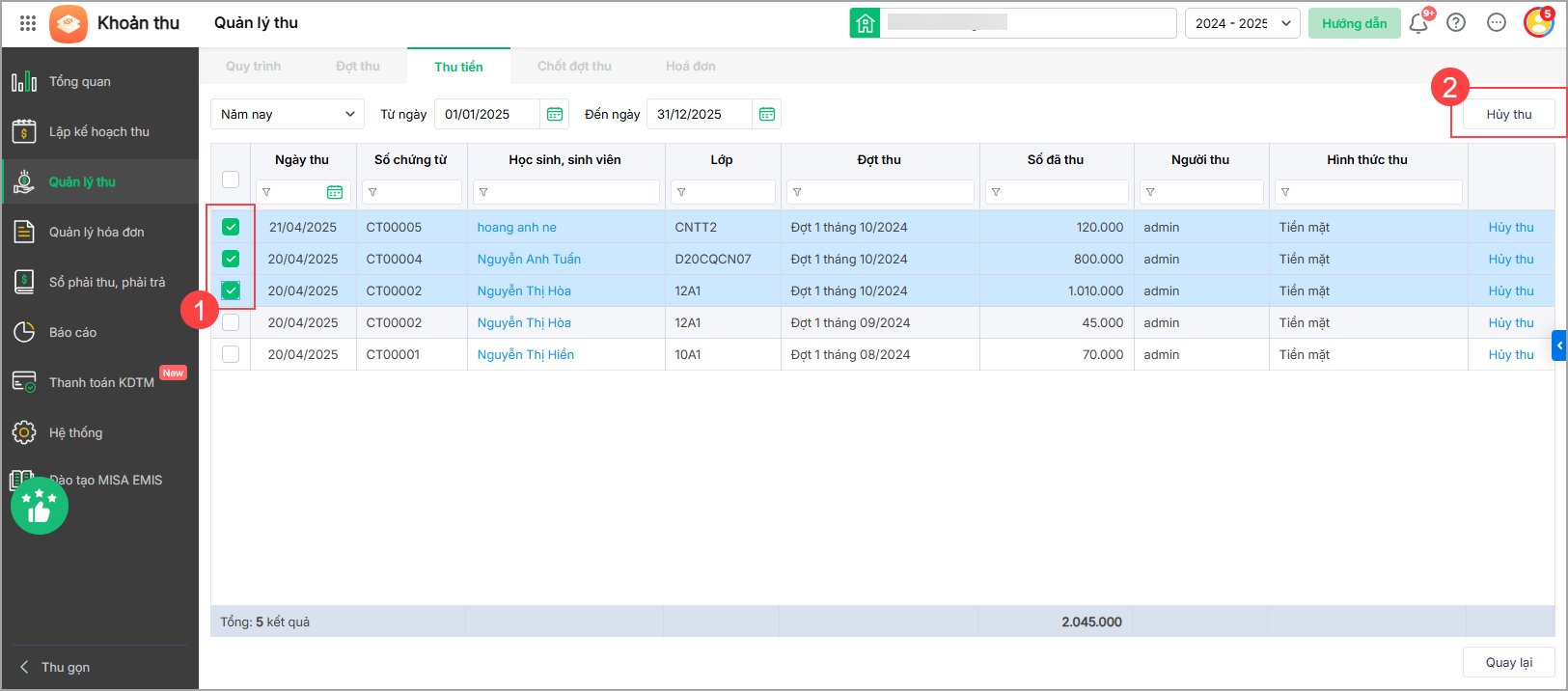 - Tích chọn các HSSV muốn hủy thu tiền, nhấn Hủy thu để hủy thu cho các HSSV đã chọn trong danh sách.