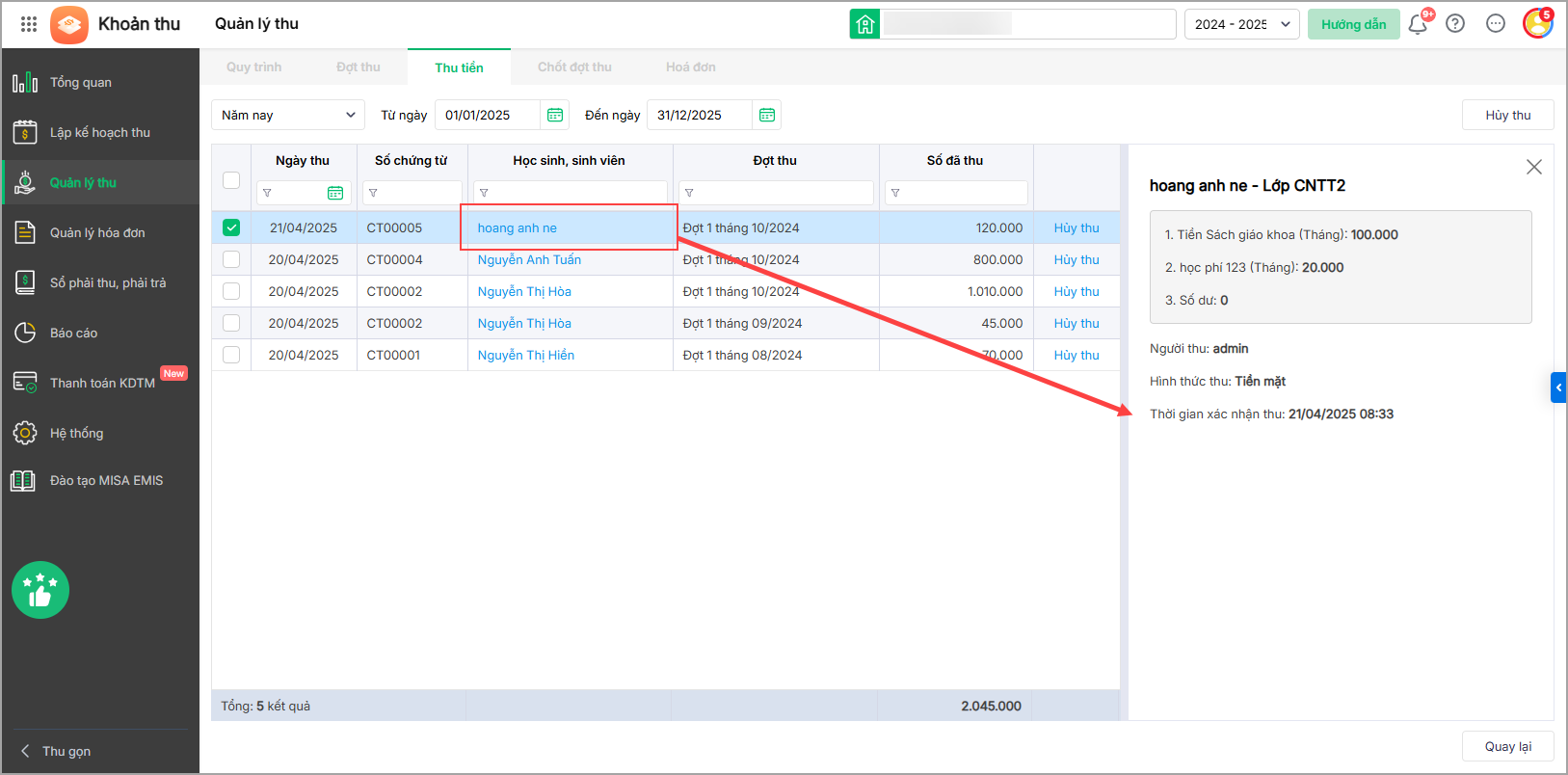 - Nhấn vào tên HSSV cần theo dõi lịch sử thu. Kế toán có thể theo dõi chính xác thông tin: tiền học; người thu, hình thức chuyển khoản và thời gian xác nhận thu tiền của HSSV để đối chiếu thông tin.