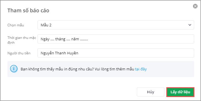 - Chọn mẫu chứng từ cần in, nhập thông tin Người thu tiền, nhấn Lấy dữ liệu.