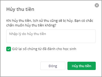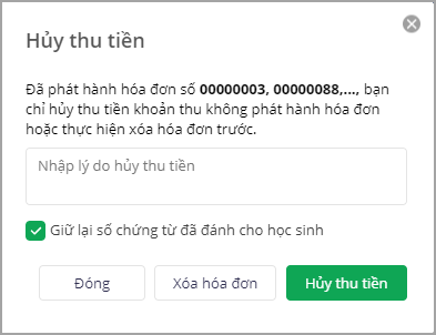 - Anh/chị có thể ghi chú lý do hủy thu tiền và tích chọn Giữ lại số chứng từ đã đánh cho HSSV.