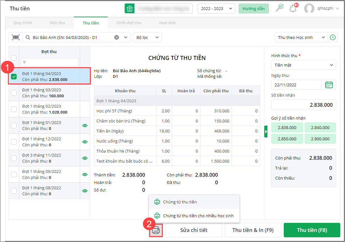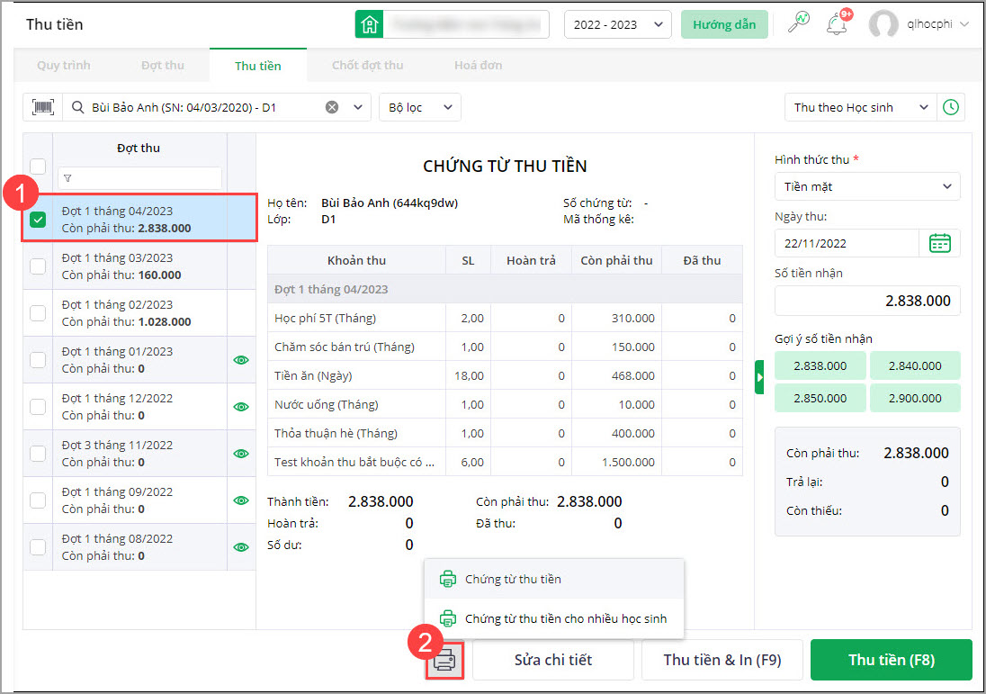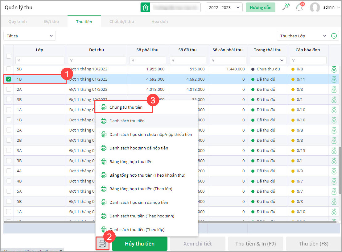 - Lựa chọn đợt thu cần in chứng từ, nhấn vào biểu tượng máy in và chọn Chứng từ thu tiền.