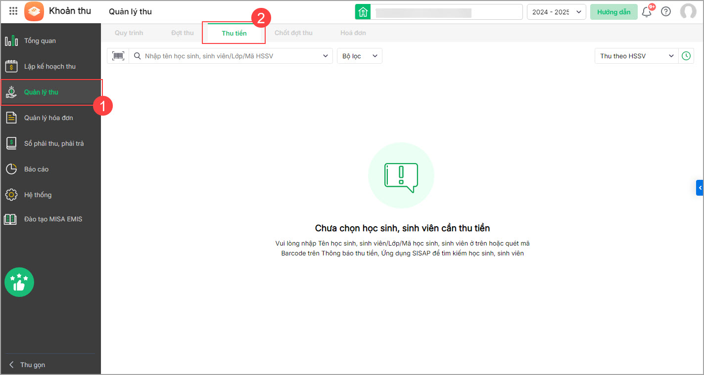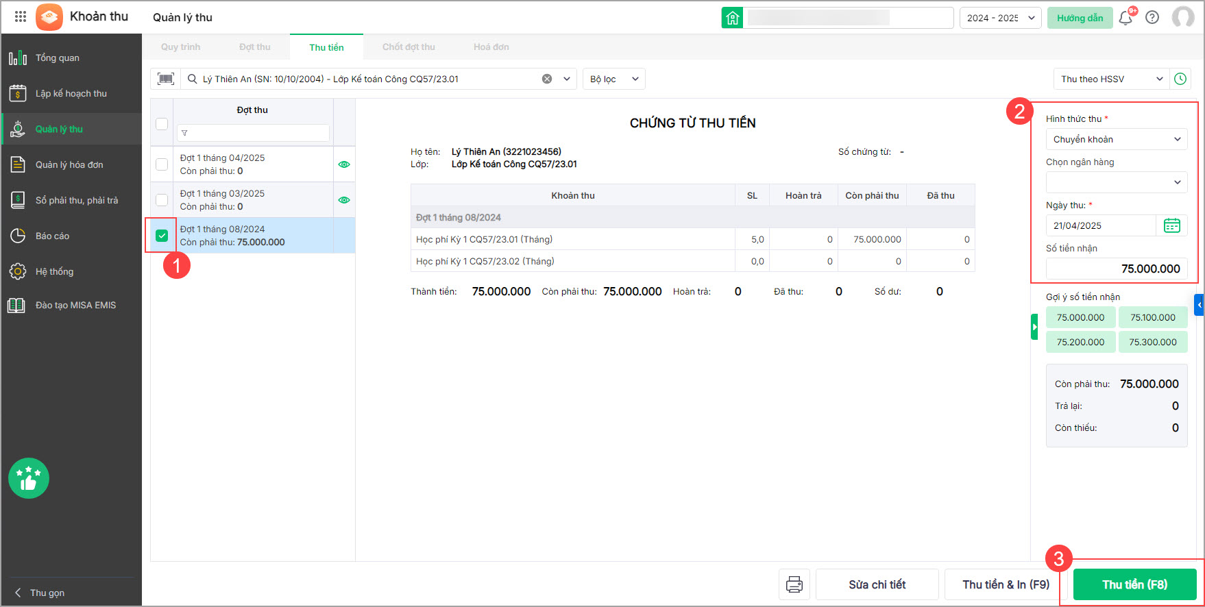- Chọn Đợt thu, Ngày thu, Hình thức thu.