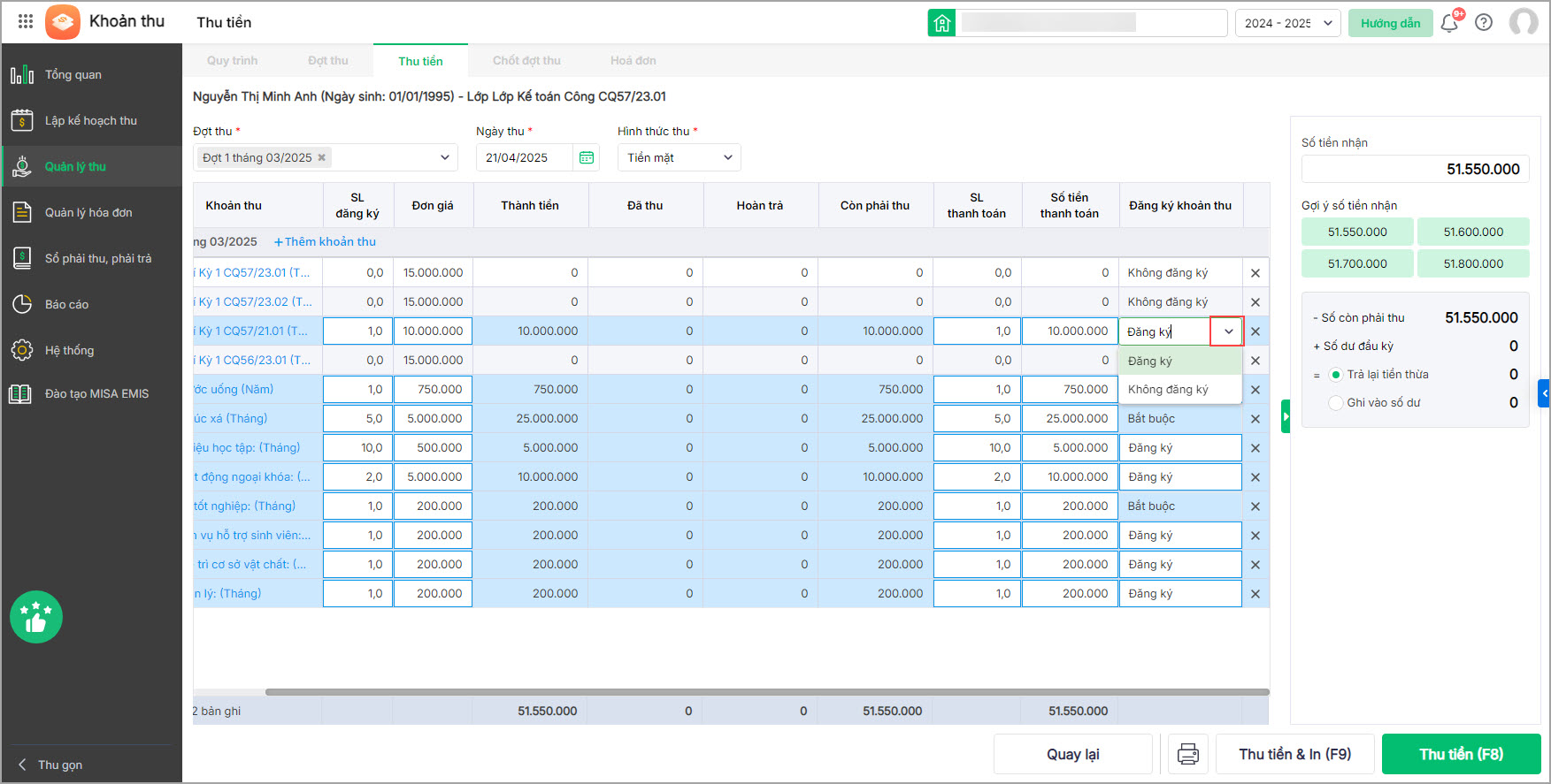 - Tích chọn các lớp và đợt thu của lớp cần thu tiền.