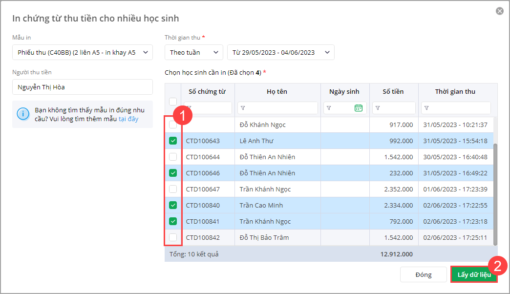 - Tích chọn các HSSV muốn in chứng từ và nhấn Lấy dữ liệu.