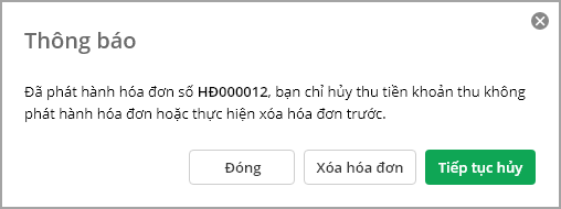 - Nhấn Tiếp tục hủy để hủy thu tiền các khoản thu chưa xuất hóa đơn.