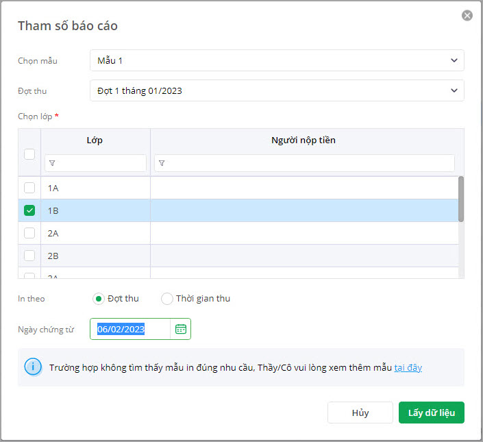 - Chọn lớp cần in và nhấn biểu tượng máy in, chọn loại Chứng từ thu tiền.