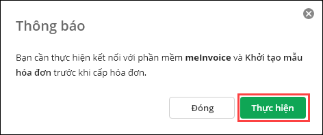 Lưu ý: Trường hợp anh/chị chưa thực hiện Kết nối meInvoice và Khởi tạo mẫu hóa đơn, phần mềm hiển thị thông báo như sau: