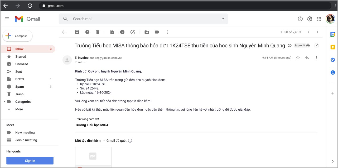 - Lúc này thì email của HSSV sẽ nhận được thông báo đã thu tiền