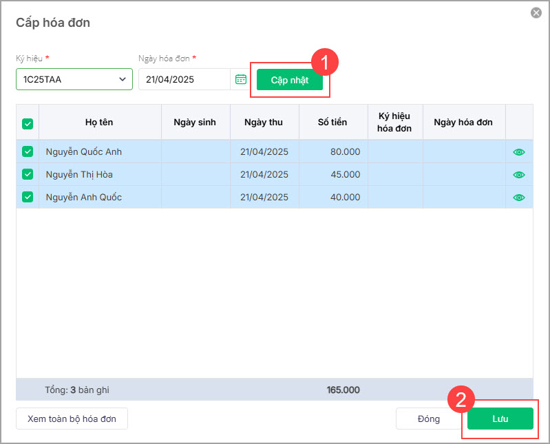- Phần mềm tự động lấy lên 1 số thông tin cấp phát và thông tin hoá đơn. Anh/chị nhấn Cập nhật để cập nhật Ký hiệu/Ngày hóa đơn cho tất cả HSSV.