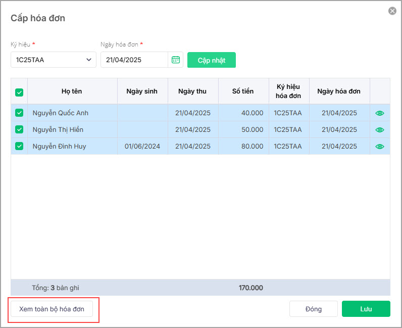 - Nhấn Xem toàn bộ hóa đơn hoặc biểu tượng đôi mắt để xem hóa đơn vừa lập.