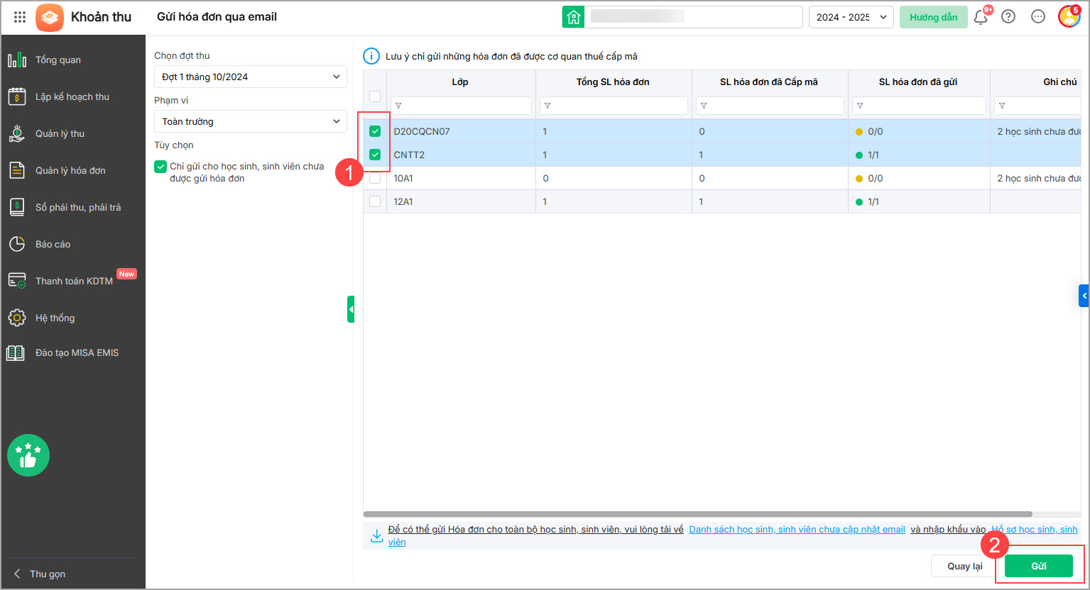 - Hoặc chọn Gửi hóa đơn cho phụ huynh để gửi cho nhiều lớp trong 1 lần gửi, tích chọn lớp muốn gửi hóa đơn, chọn Gửi