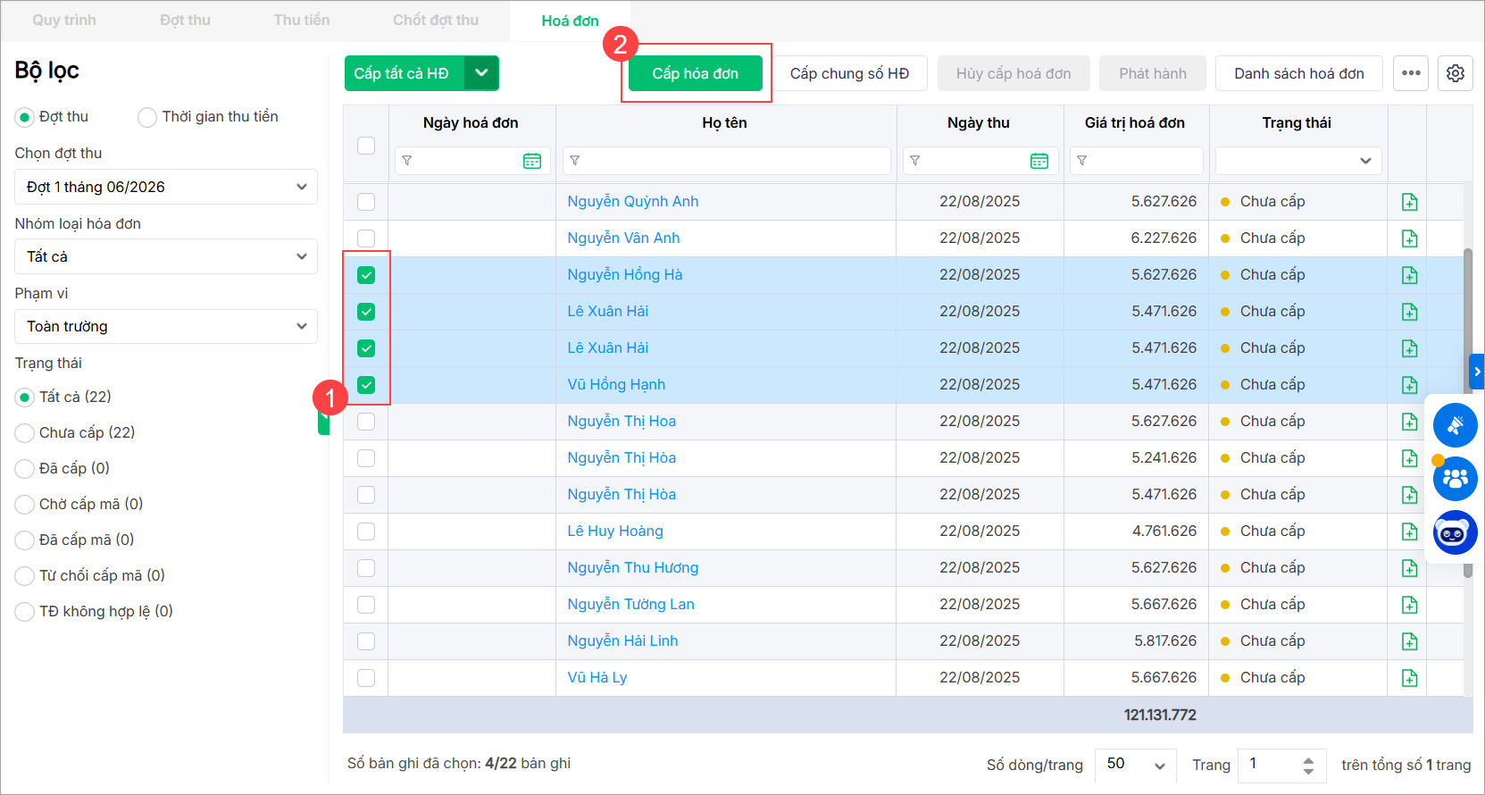 - Tích chọn một hoặc nhiều HSSV có khoản thu tương ứng cần cấp hóa đơn. Nhấn Cấp hóa đơn để cấp hóa đơn cho nhiều HSSV cùng lúc.