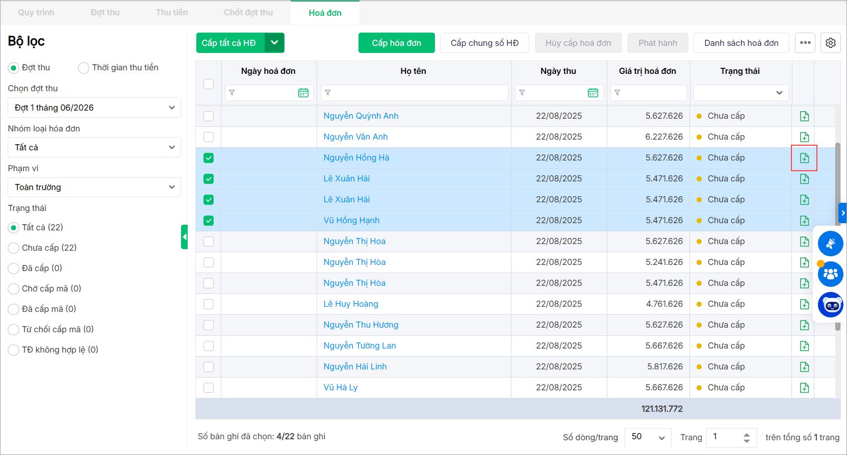 - Hoặc biểu tượng bên dưới tại dòng tên HSSV để cấp hóa đơn cho chính HSSV đó.