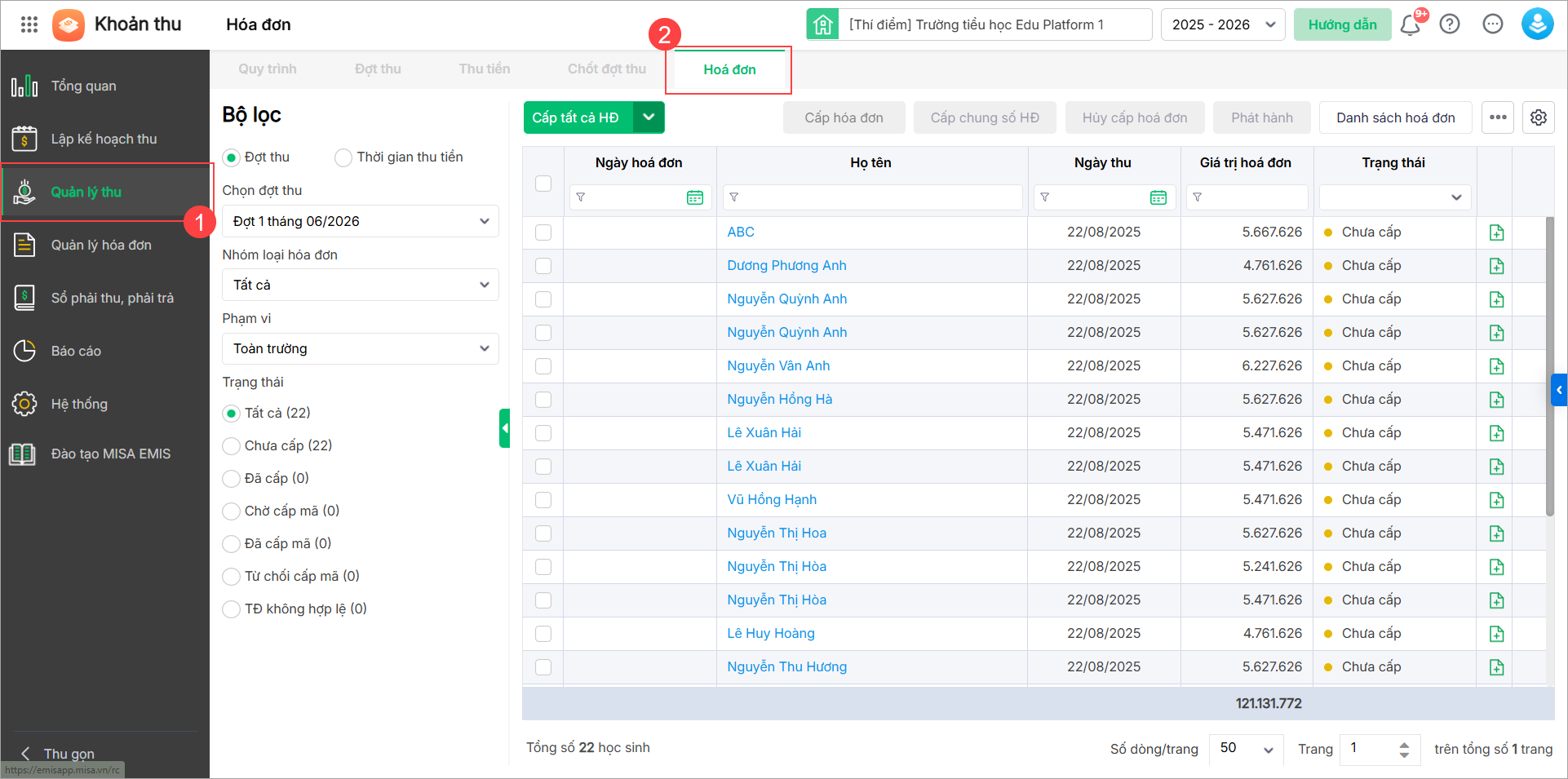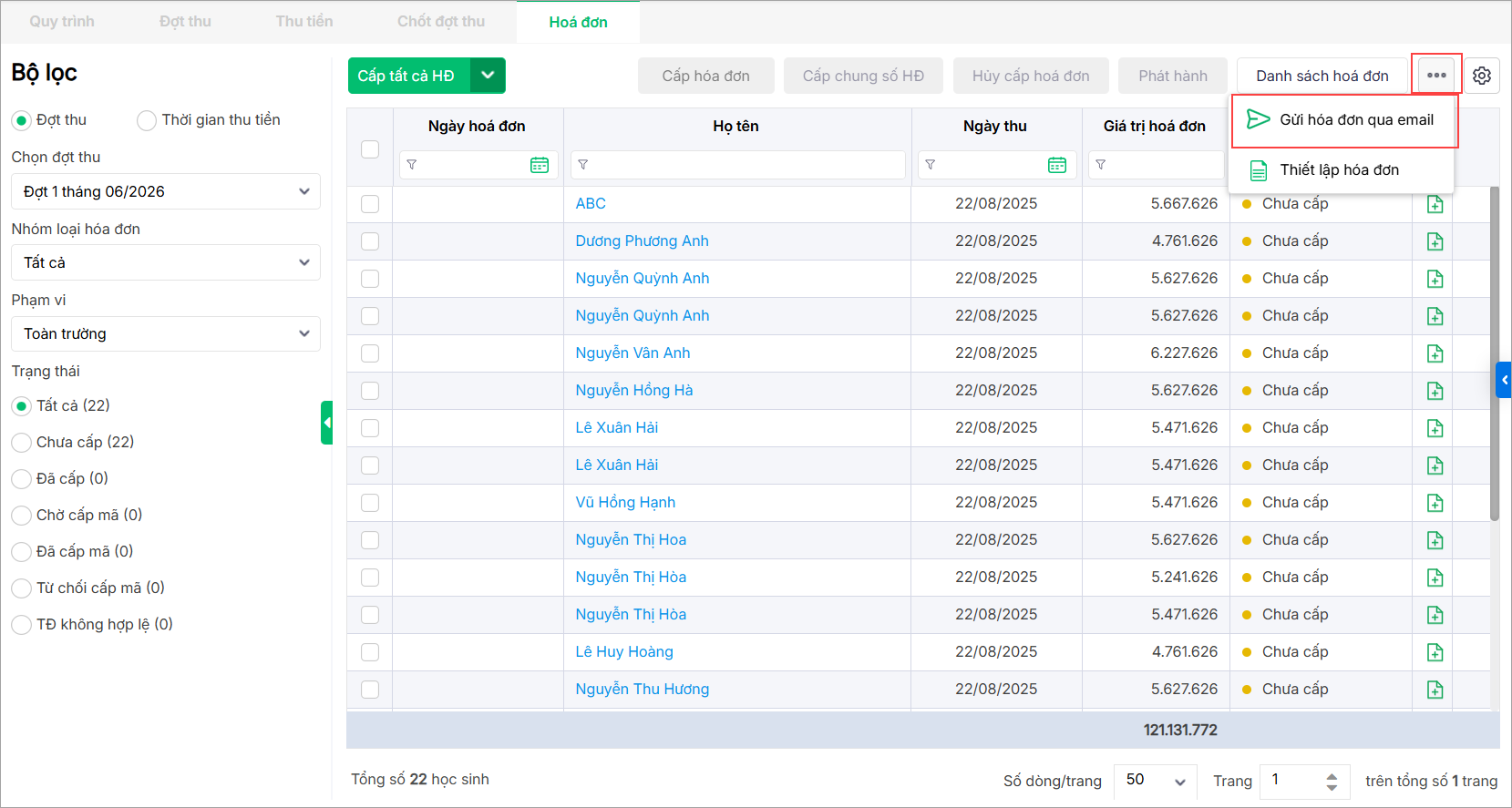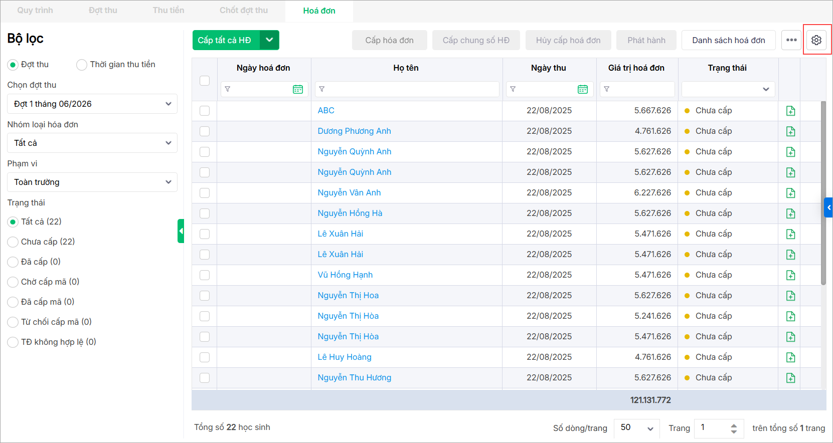 - Sử dụng Bộ lọc để tìm kiếm nhanh thông tin HSSV với khoản thu tương ứng để cấp hóa đơn.
