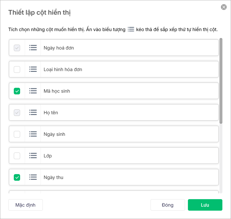 - Tích chọn những cột thông tin muốn hiển thị và kéo thả để thay đổi vị trí hiển thị.