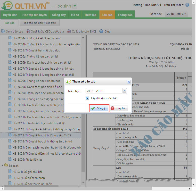 1. Chọn Học sinh\Báo cáo\Báo cáo\HS-BC13: Thống kê học sinh tốt nghiệp THCS