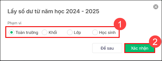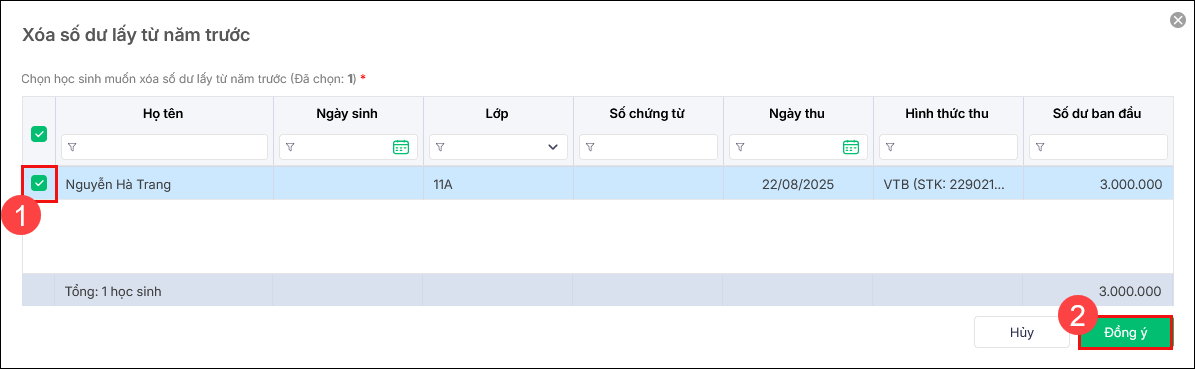 Bước 3: Trường hợp không muốn xem danh sách HSSV có số dư cuối bằng 0 thì anh/chị bỏ tích chọn Theo dõi tất cả học sinh có số dư cuối bằng 0.