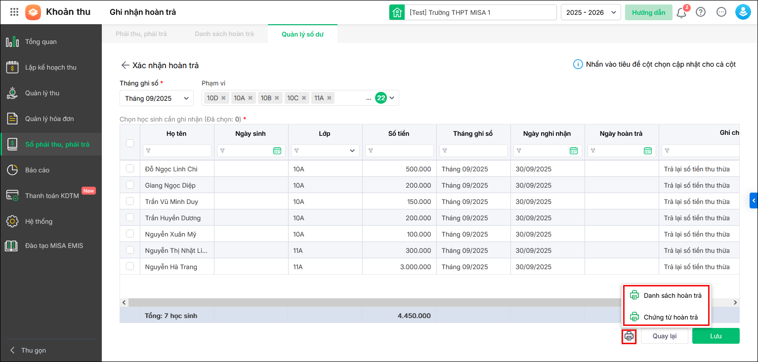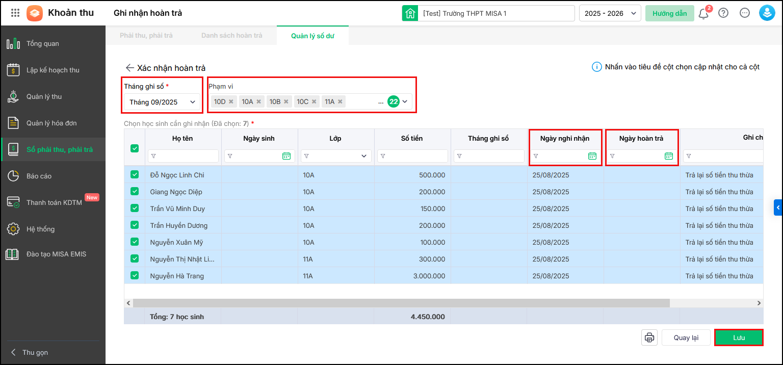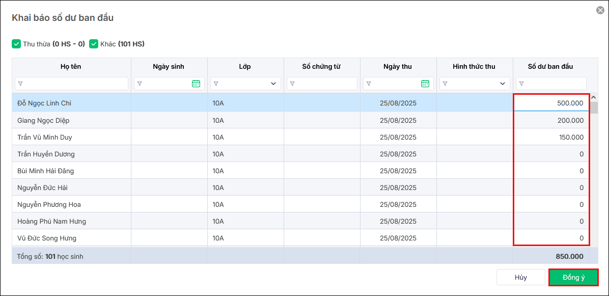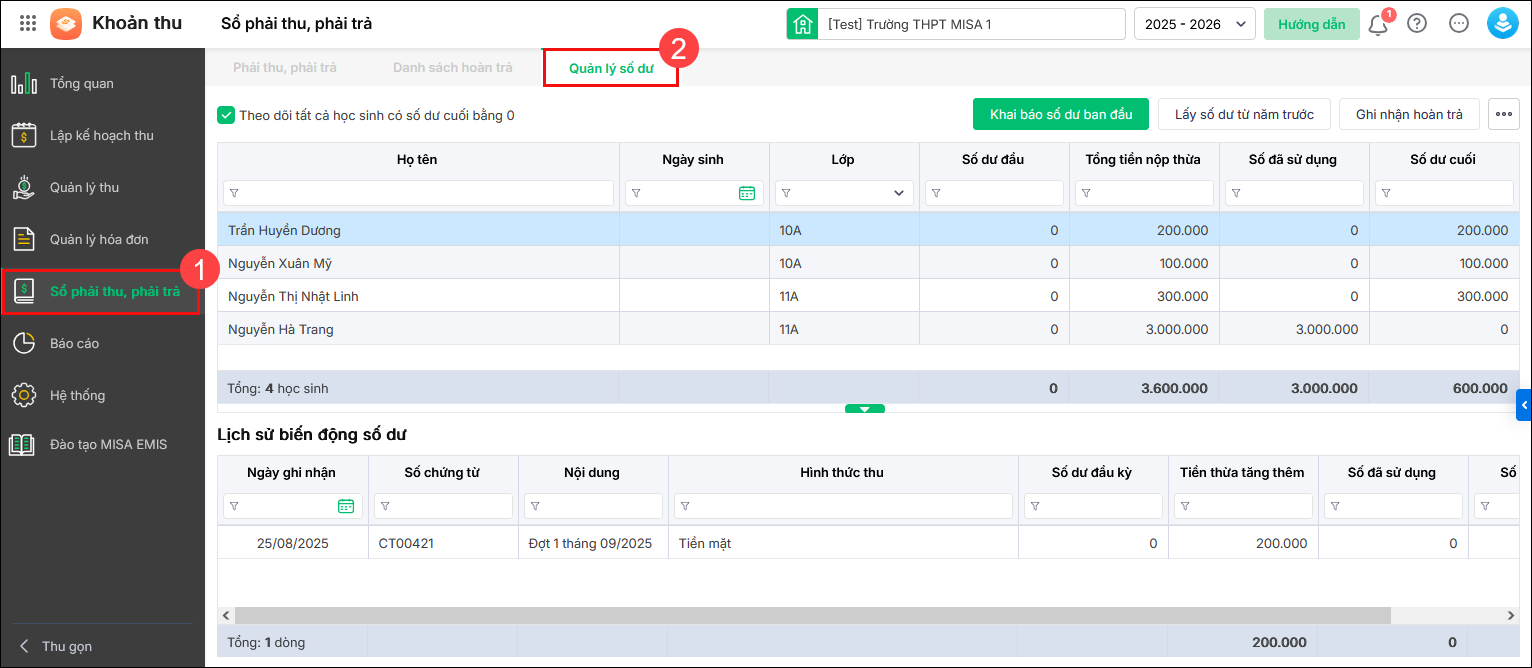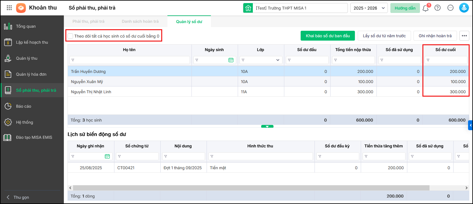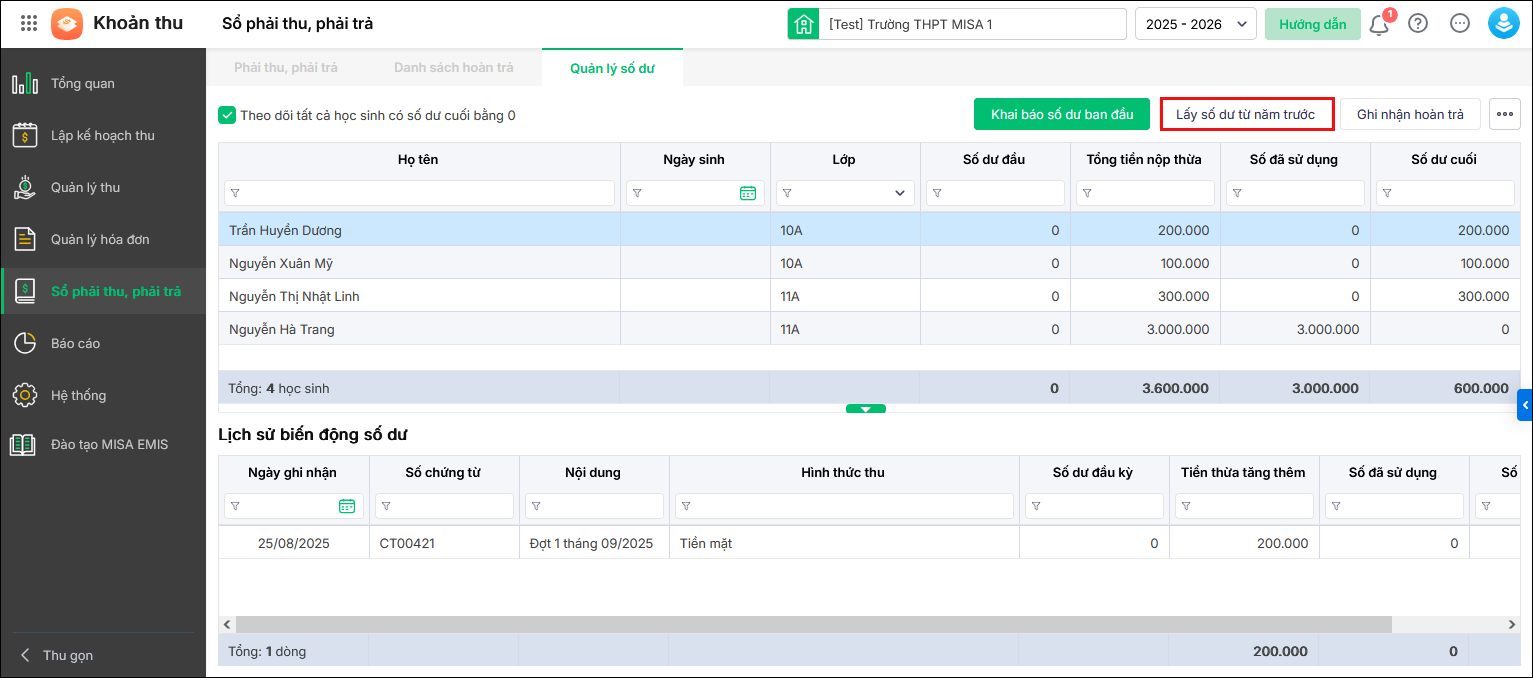 Bước 2: Phần mềm tự động lấy lên danh sách HSSV cùng Số dư đầu, Số tiền nộp thừa, Số đã sử dụng, Số dư cuối sau khi kế toán thực hiện chốt đợt thu.