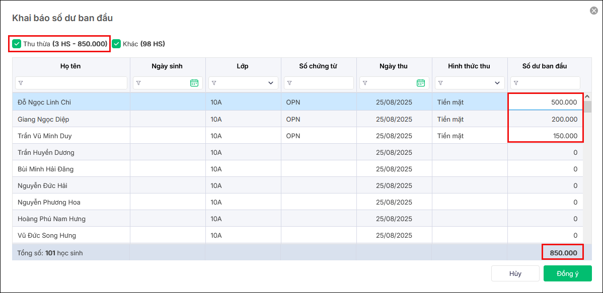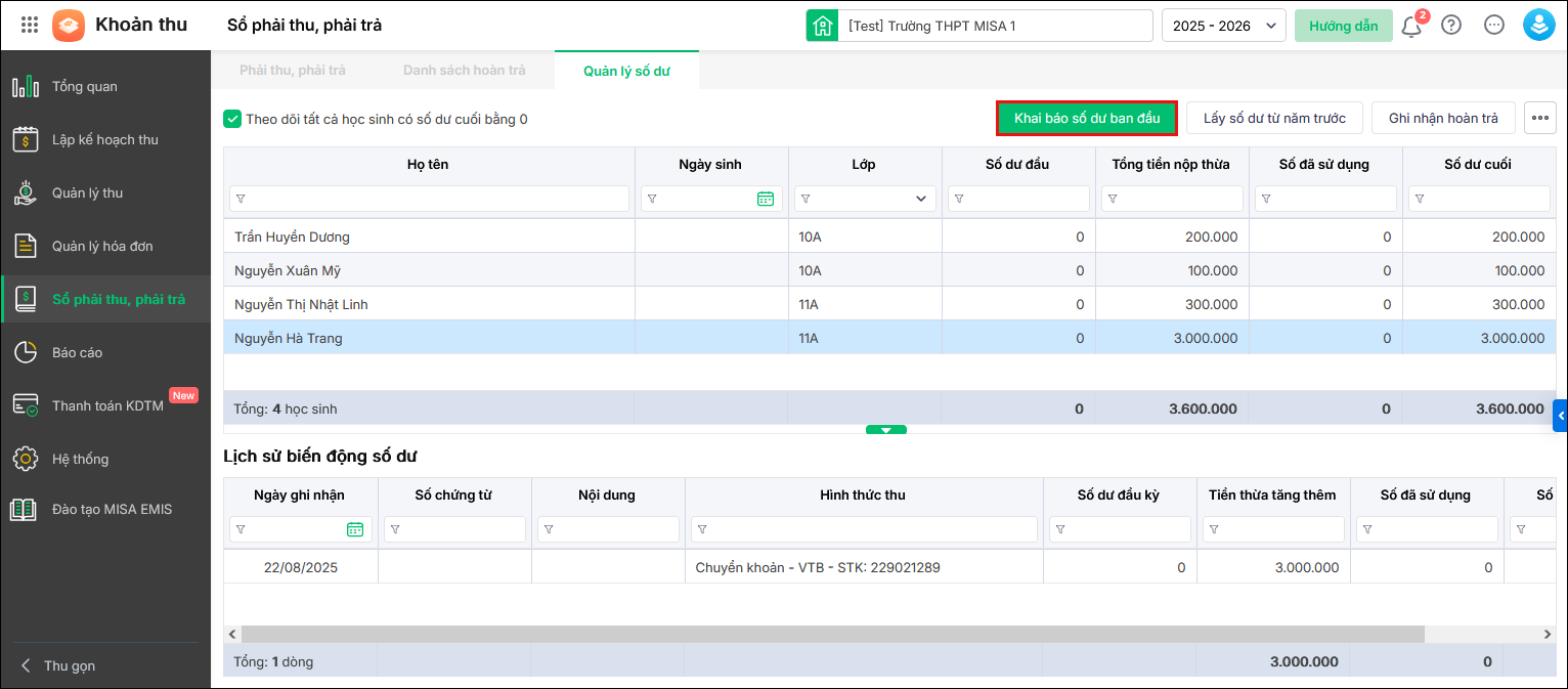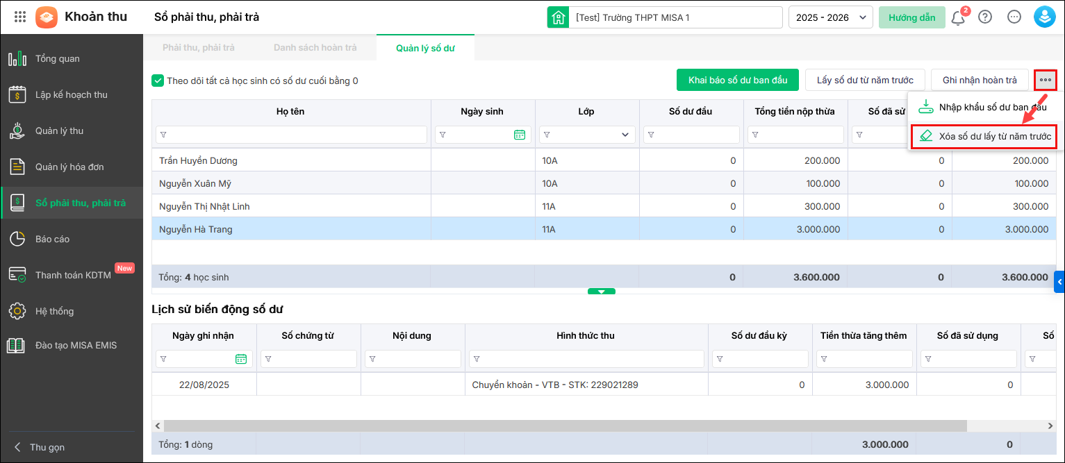 Giúp kế toán nhập khẩu được số dư thừa thiếu của HSSV từ bên ngoài vào khi bắt đầu sử dụng phần mềm và quản lý số dư nộp tiền thừa của HSSV sau khi ghi nhận thành số dư.