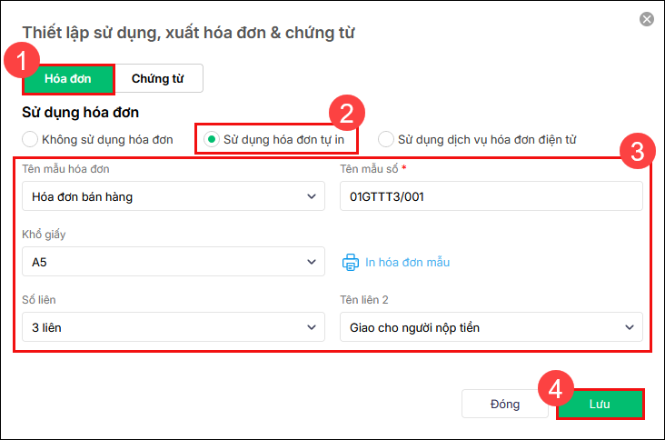 - Thiết lập các thông tin trên hóa đơn tự in: Tên mẫu hóa đơn, Tên mẫu số, Khổ giấy, Số liên và Tên liên.