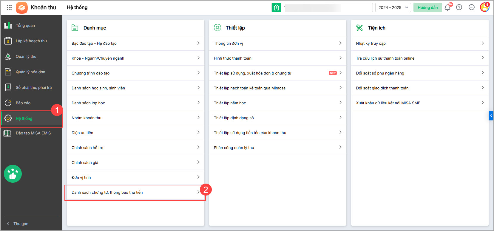 - Vào menu Hệ thống\Danh sách chứng từ, thông báo thu tiền.