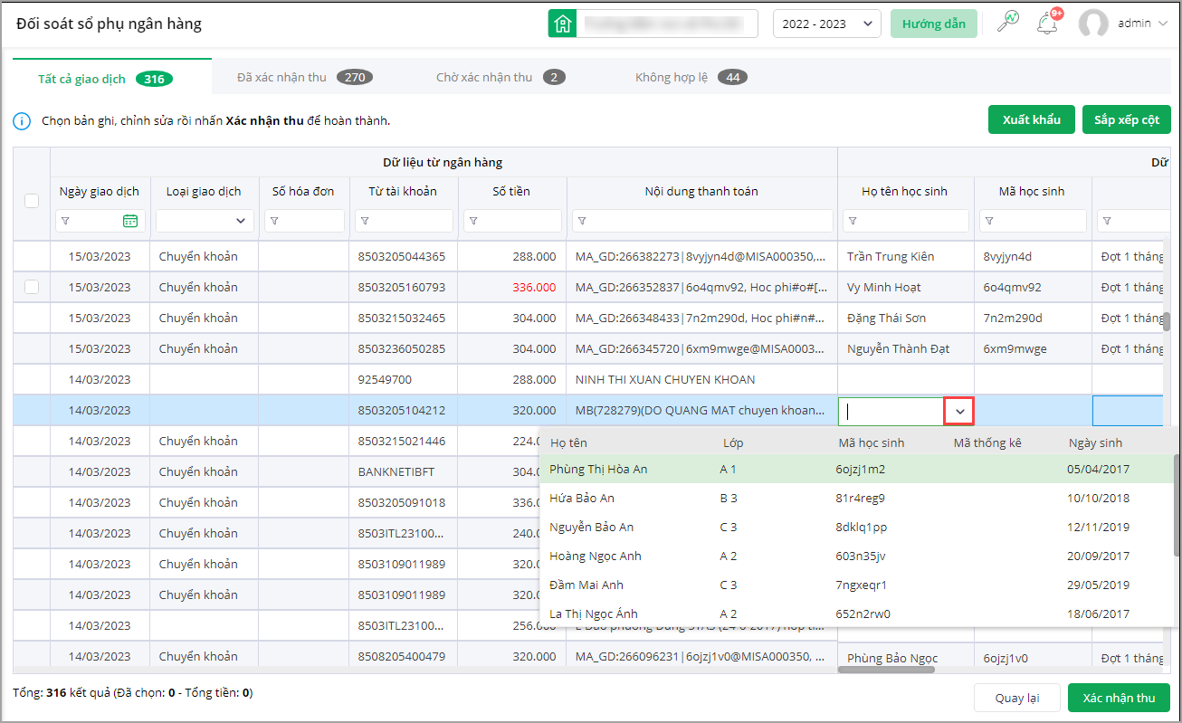 - Đã xác nhận thu: Là các giao dịch mà phần mềm đã tự động kiểm tra và xác nhận rằng học sinh đã thanh toán học phí thành công.