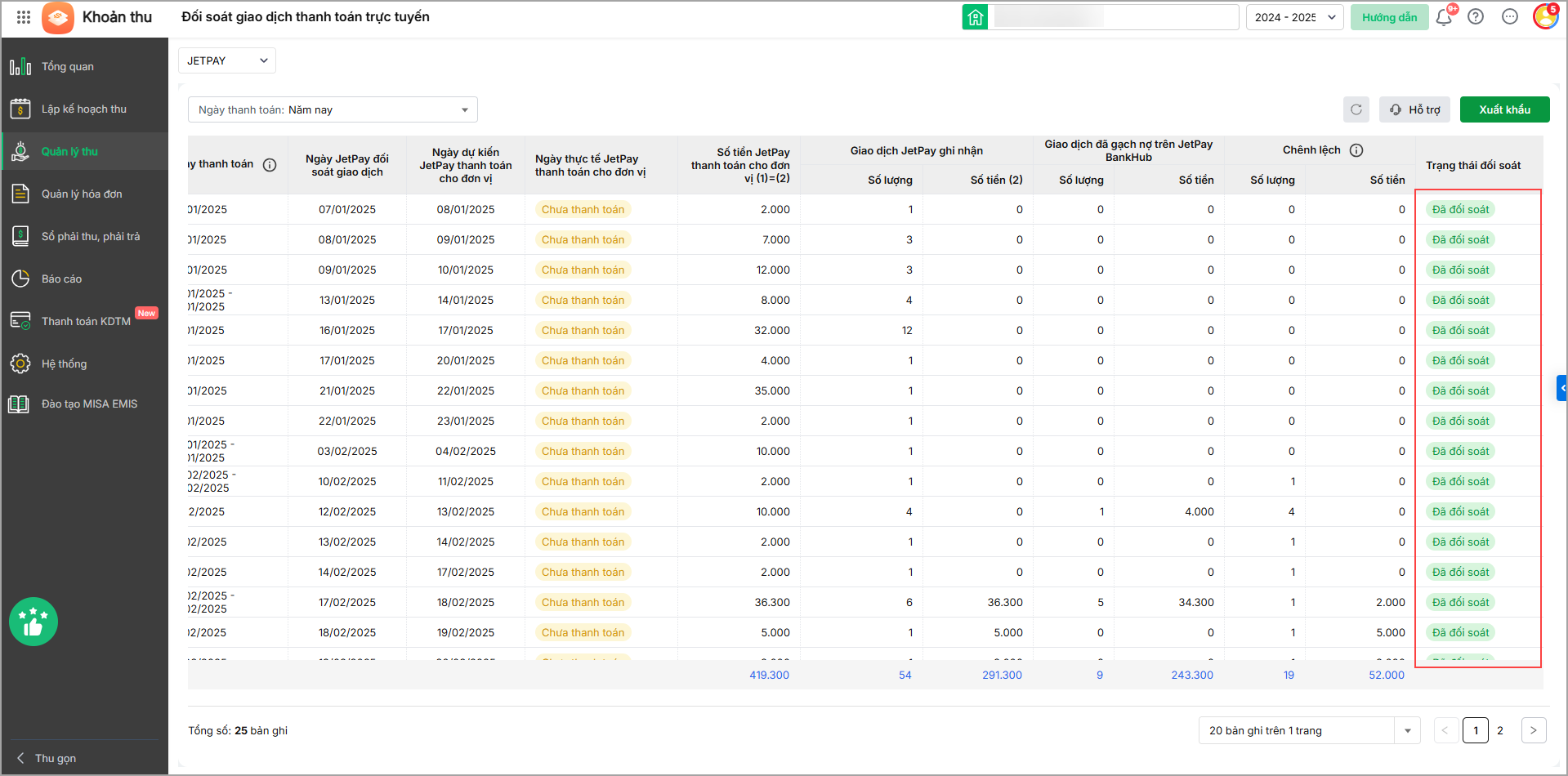 - Vào menu Quản lý thu\Đối soát giao dịch thanh toán