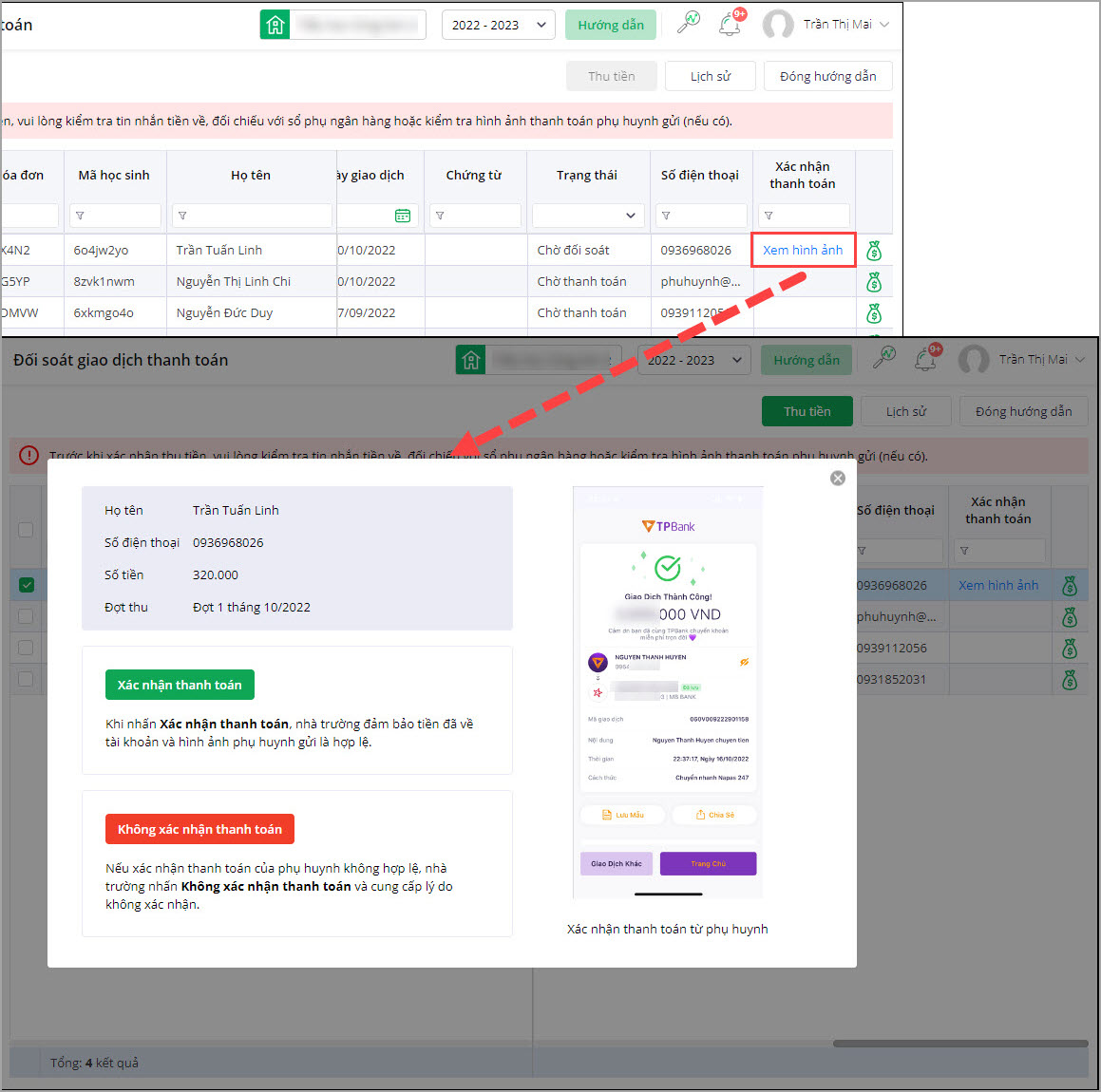 - Nếu hình ảnh giao dịch gửi từ HSSV hợp lệ, kế toán kiểm tra số tiền thực nhận đã về tài khoản nhà trường và chọn Xác nhận thanh toán.