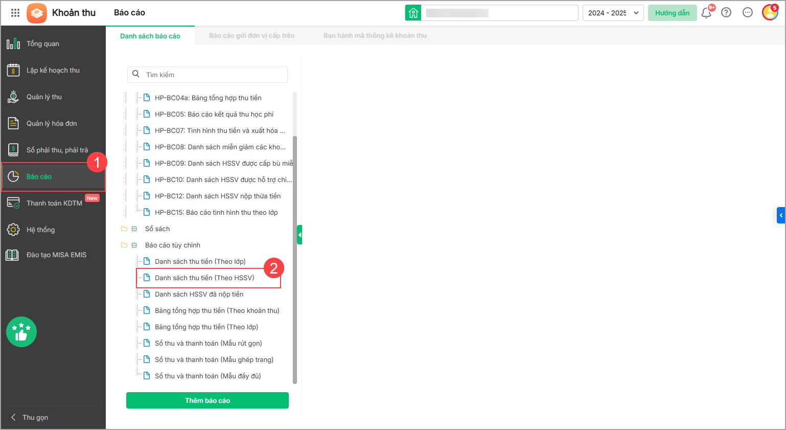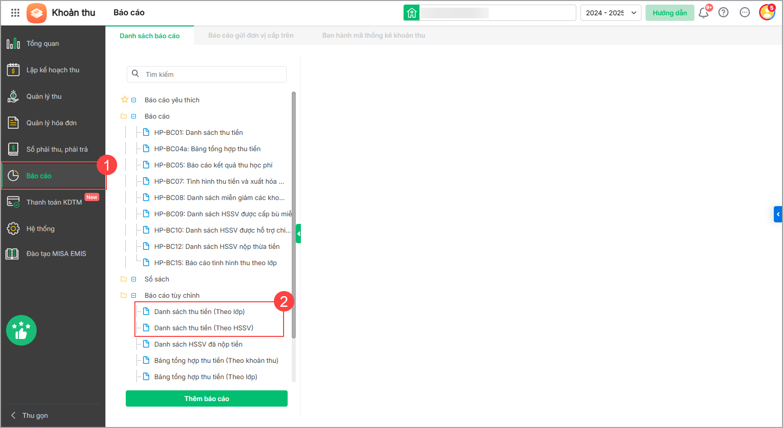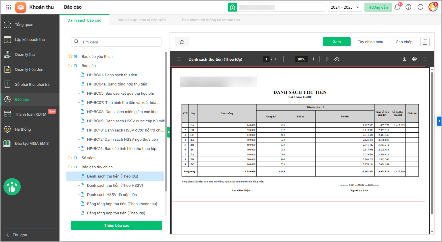 - Chọn mẫu báo cáo Danh sách thu tiền theo lớp hoặc Danh sách thu tiền theo HSSV cần in.