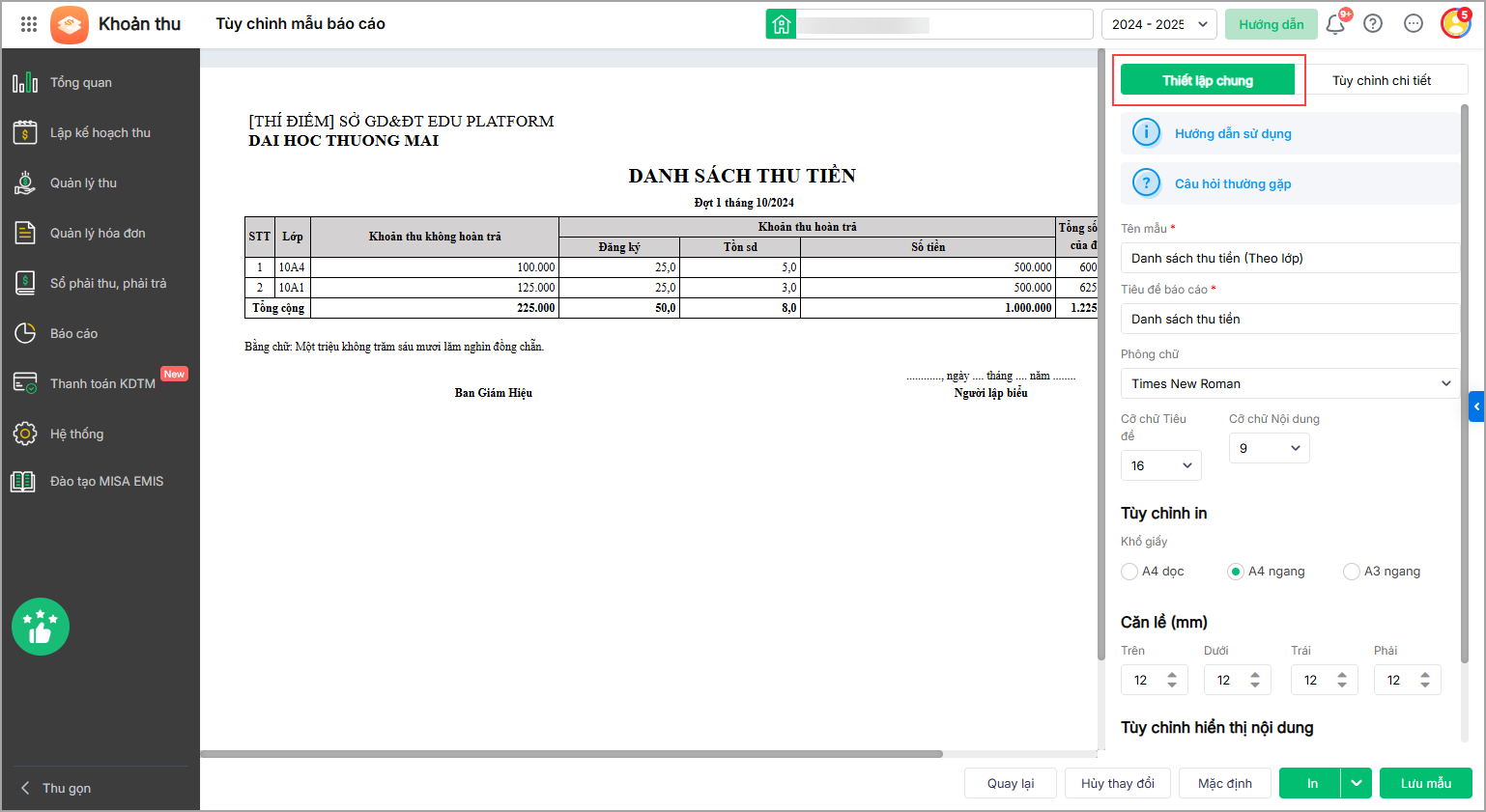 - Tại phần Thiết lập chung, anh/chị thiết lập thông tin chung cho phần hiển thị: Tên mẫu, Tiêu đề báo cáo, Phông chữ, Khổ giấy, Lề, Tùy chọn hiển thị nội dung lên Danh sách thu tiền (Hiển thị chân chữ ký hay Đọc số tiền thu bằng chữ).