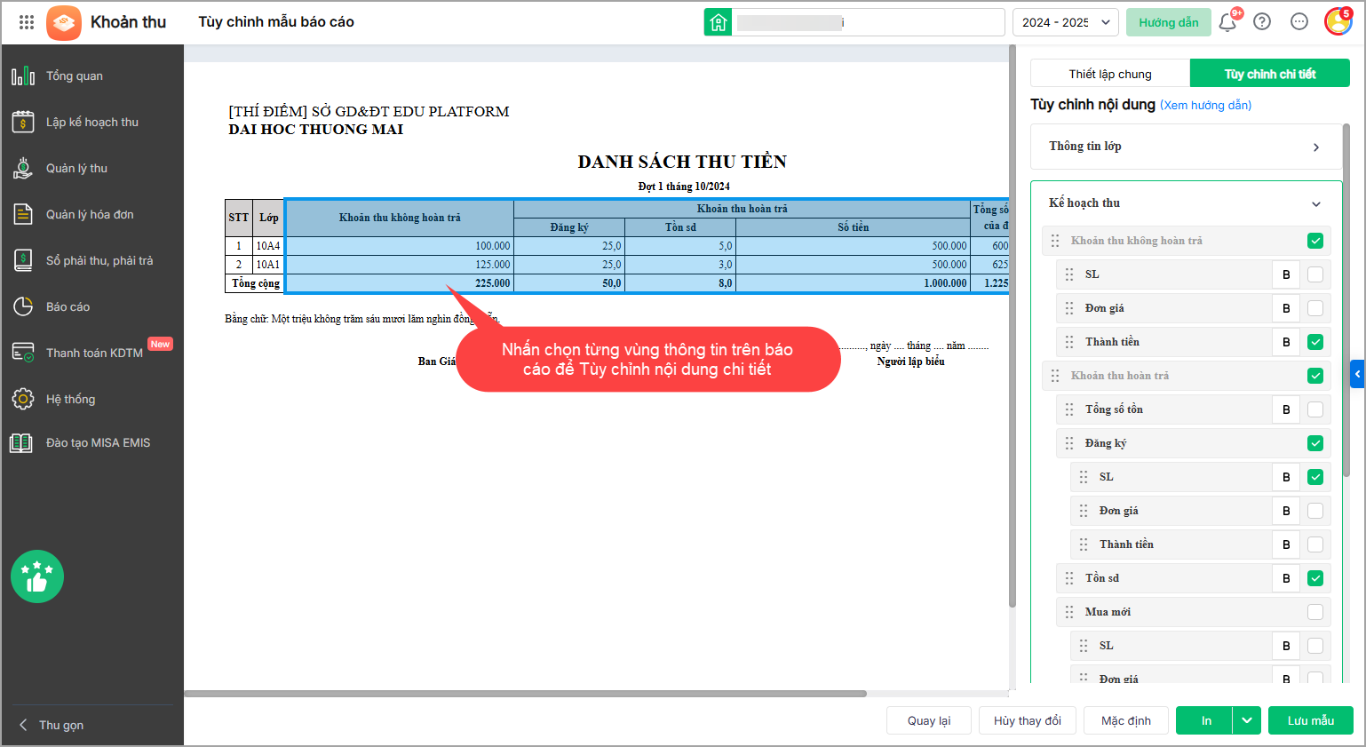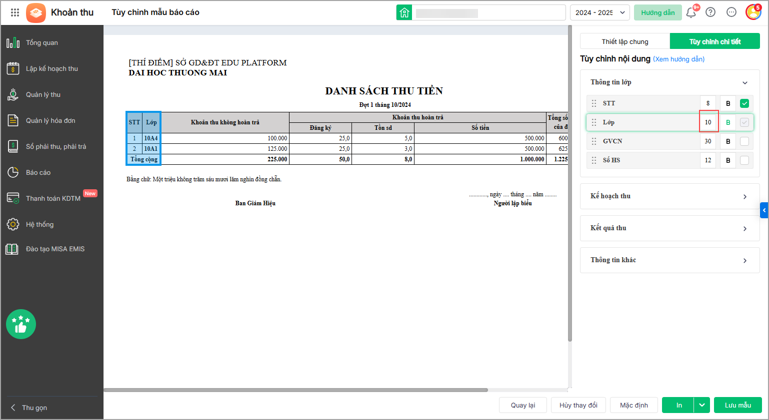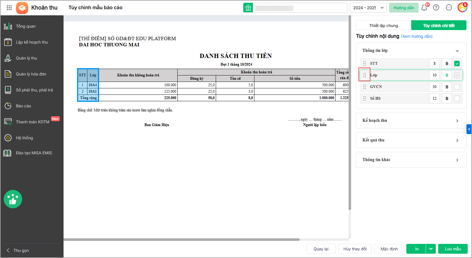 - Sau khi thực hiện chỉnh sửa xong, nhấn Lưu mẫu để lưu lại mẫu báo cáo vào kho mẫu trên EMIS Khoản thu để sử dụng cho các lần in báo cáo tiếp theo.