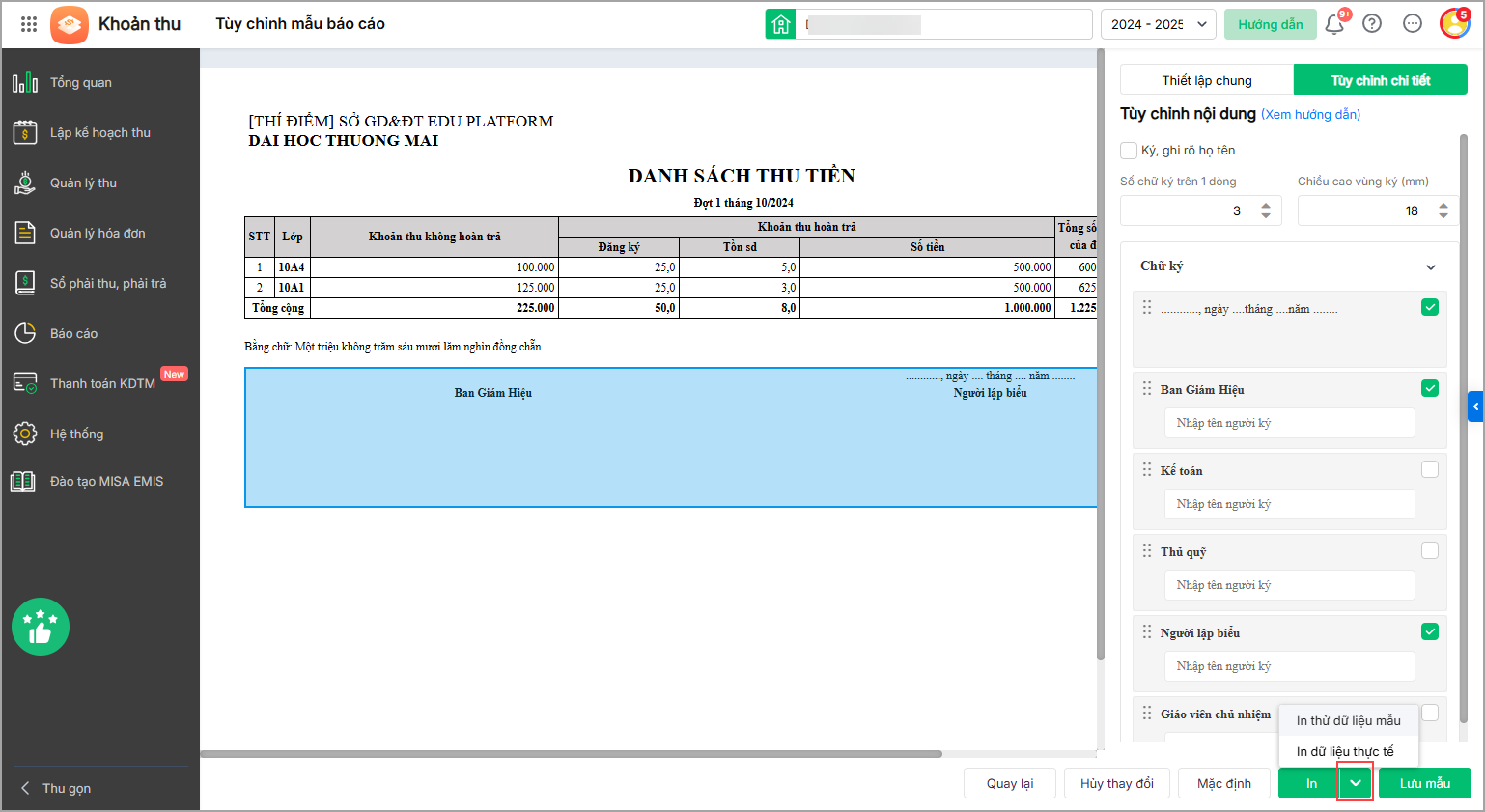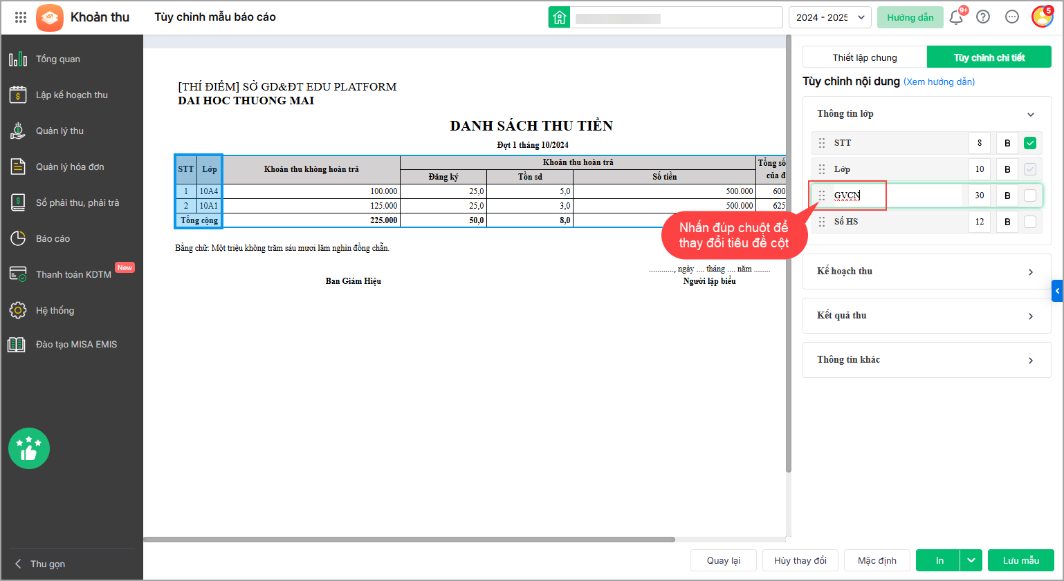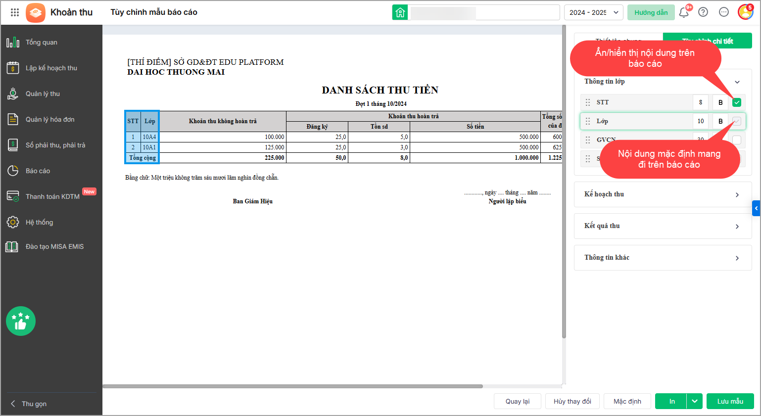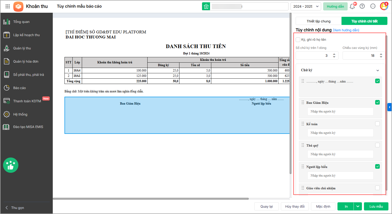 - Sau khi thực hiện chỉnh sửa xong, nhấn Lưu mẫu để lưu lại mẫu báo cáo vào kho mẫu trên EMIS Khoản thu để sử dụng cho các lần in báo cáo tiếp theo.