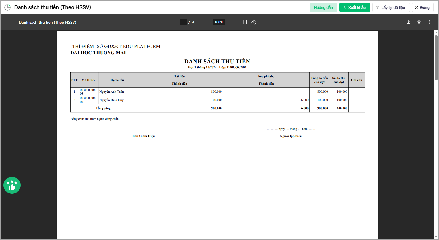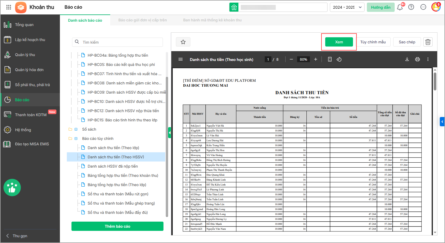 - Vào Báo cáo\Danh sách thu tiền (Theo HSSV)