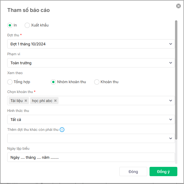 - Chọn Xem theo: Tổng hợp (chỉ hiển thị cột số tiền của tổng tất cả khoản thu); Khoản thu hoặc Nhóm khoản thu.