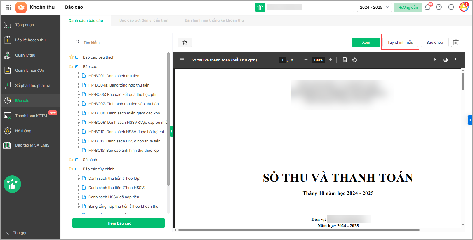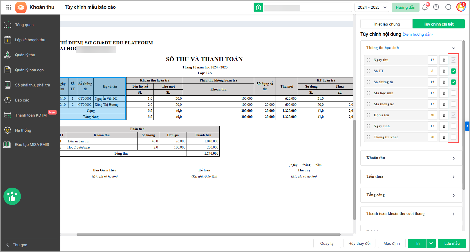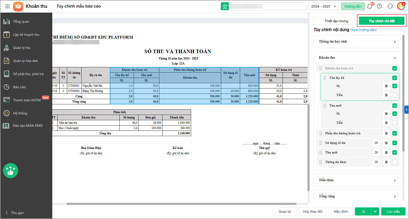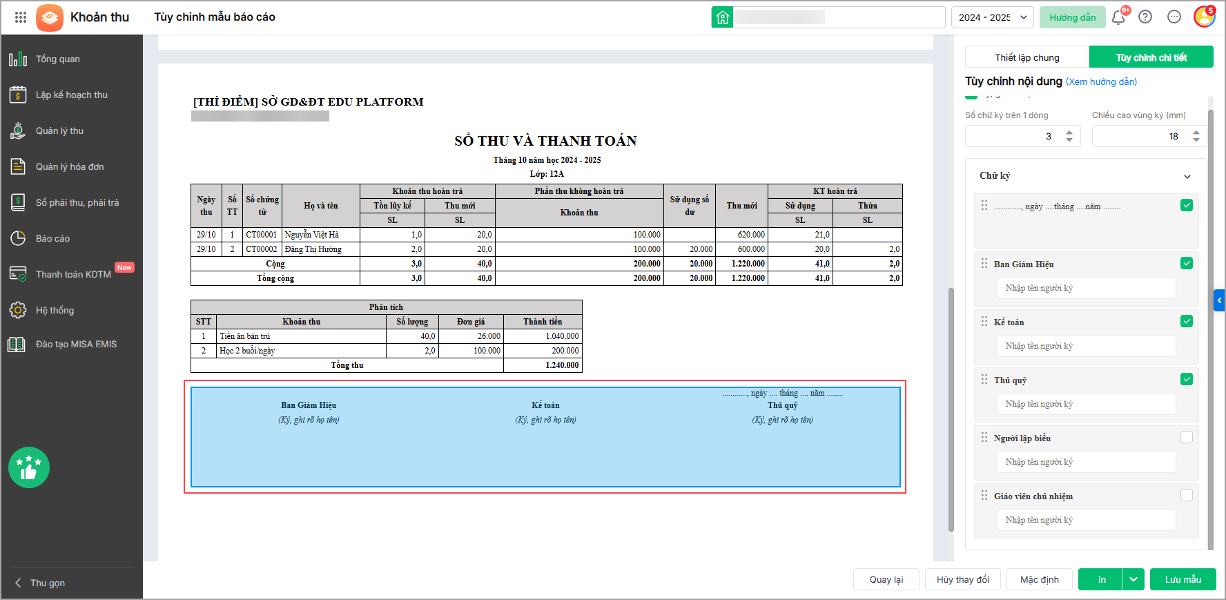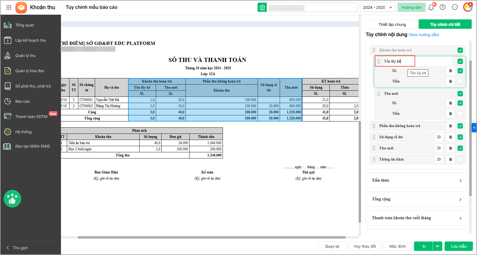 - Sau khi thực hiện chỉnh sửa xong, nhấn Lưu mẫu để lưu lại mẫu báo cáo vào kho mẫu trên EMIS Khoản thu để sử dụng cho các lần in báo cáo tiếp theo.