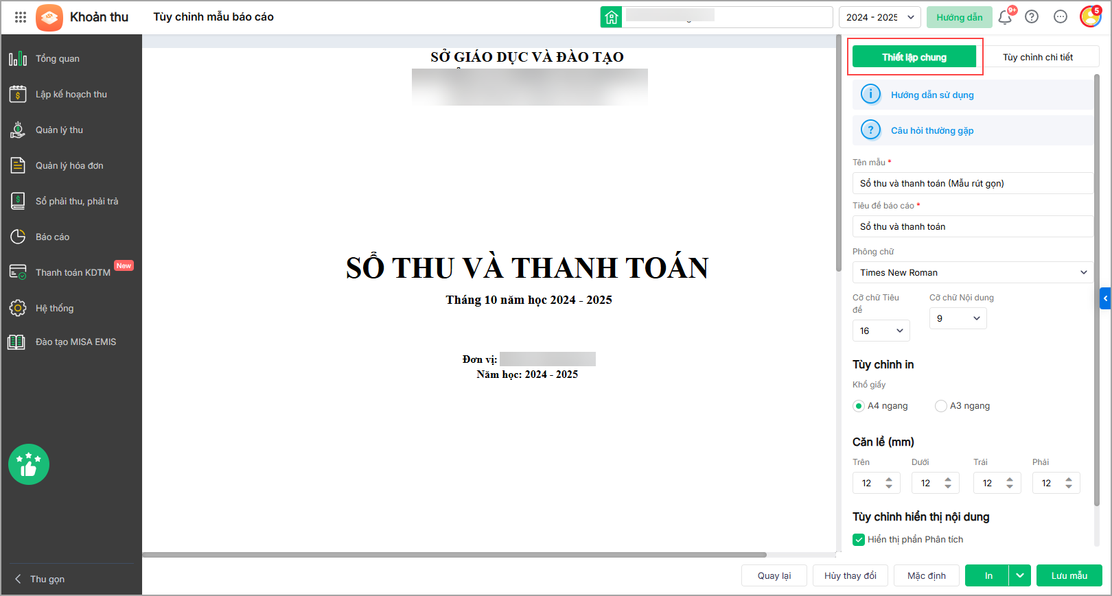 - Tại phần Thiết lập chung, anh/chị thiết lập thông tin chung cho phần hiển thị: Tên mẫu, Tiêu đề báo cáo, phông chữ, Khổ giấy, Lề, Tùy chọn hiển thị nội dung lên sổ thu và thanh toán như chân chữ ký hay phần phân tích.