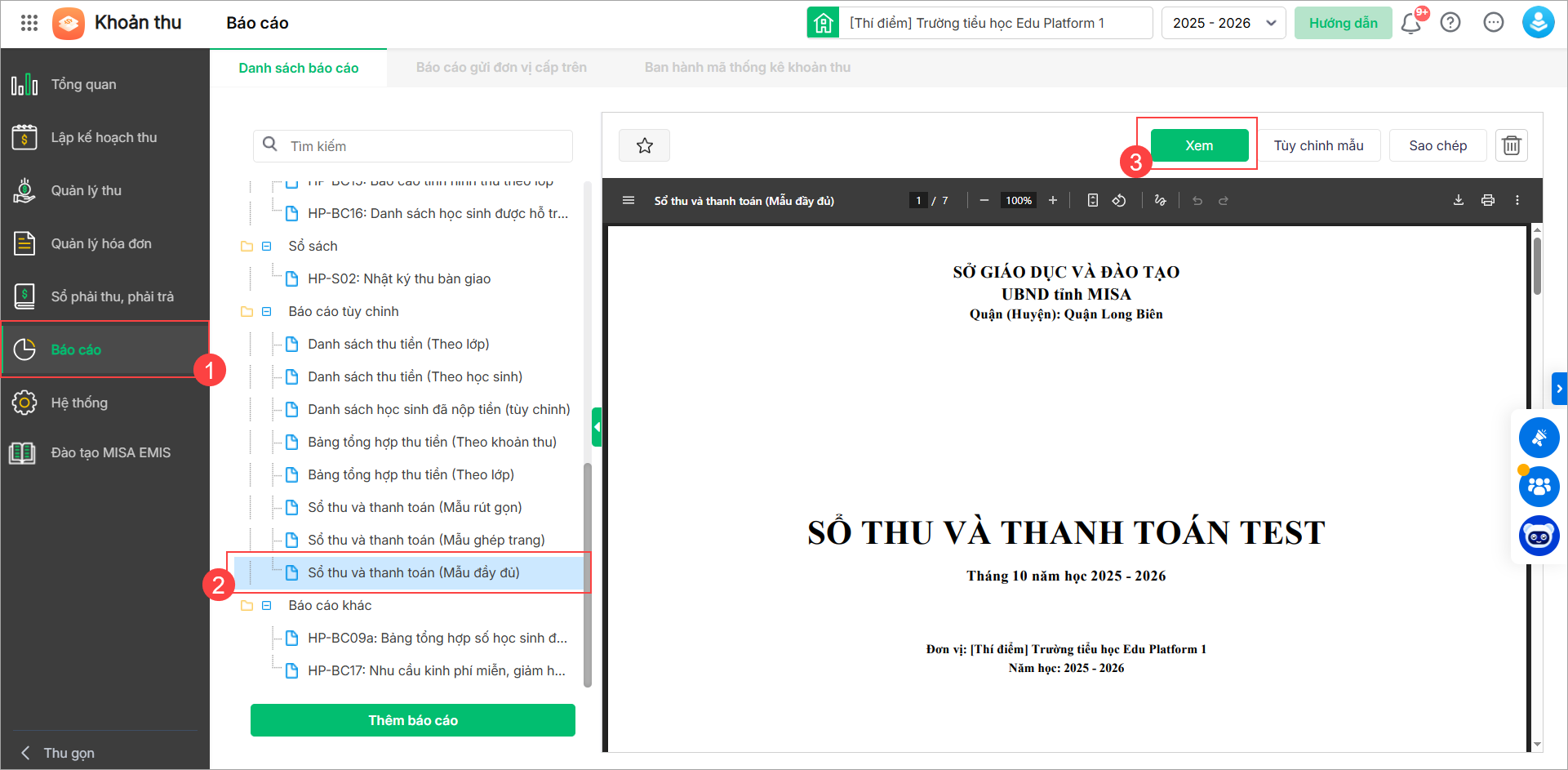 - Nhấp đúp chuột vào báo cáo cần xem trên danh sách hoặc chọn báo cáo trên danh sách, nhấn Xem