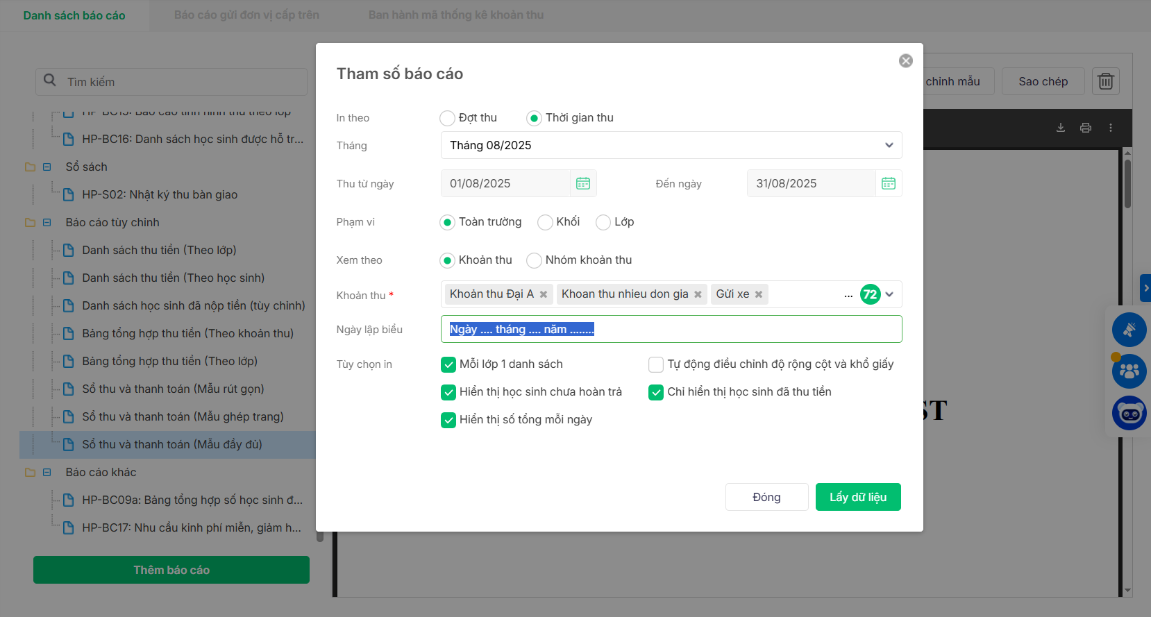 Giúp anh/chị dễ dàng tùy chỉnh báo cáo Sổ thu và thanh toán theo đúng mẫu của đơn vị.