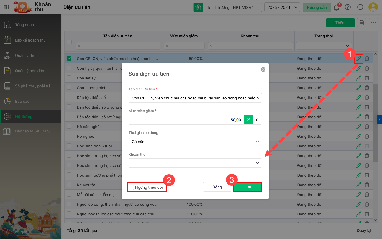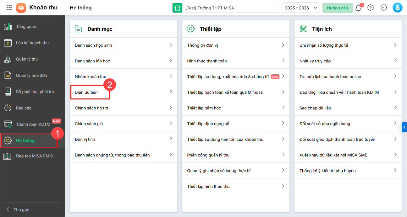 Vào Khoản thu\Hệ thống\Danh mục\Diện ưu tiên