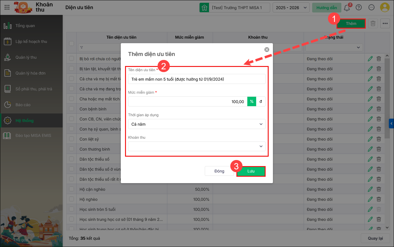 1. Nhấn Thêm để thêm diện ưu tiên có phát sinh tại trường.
