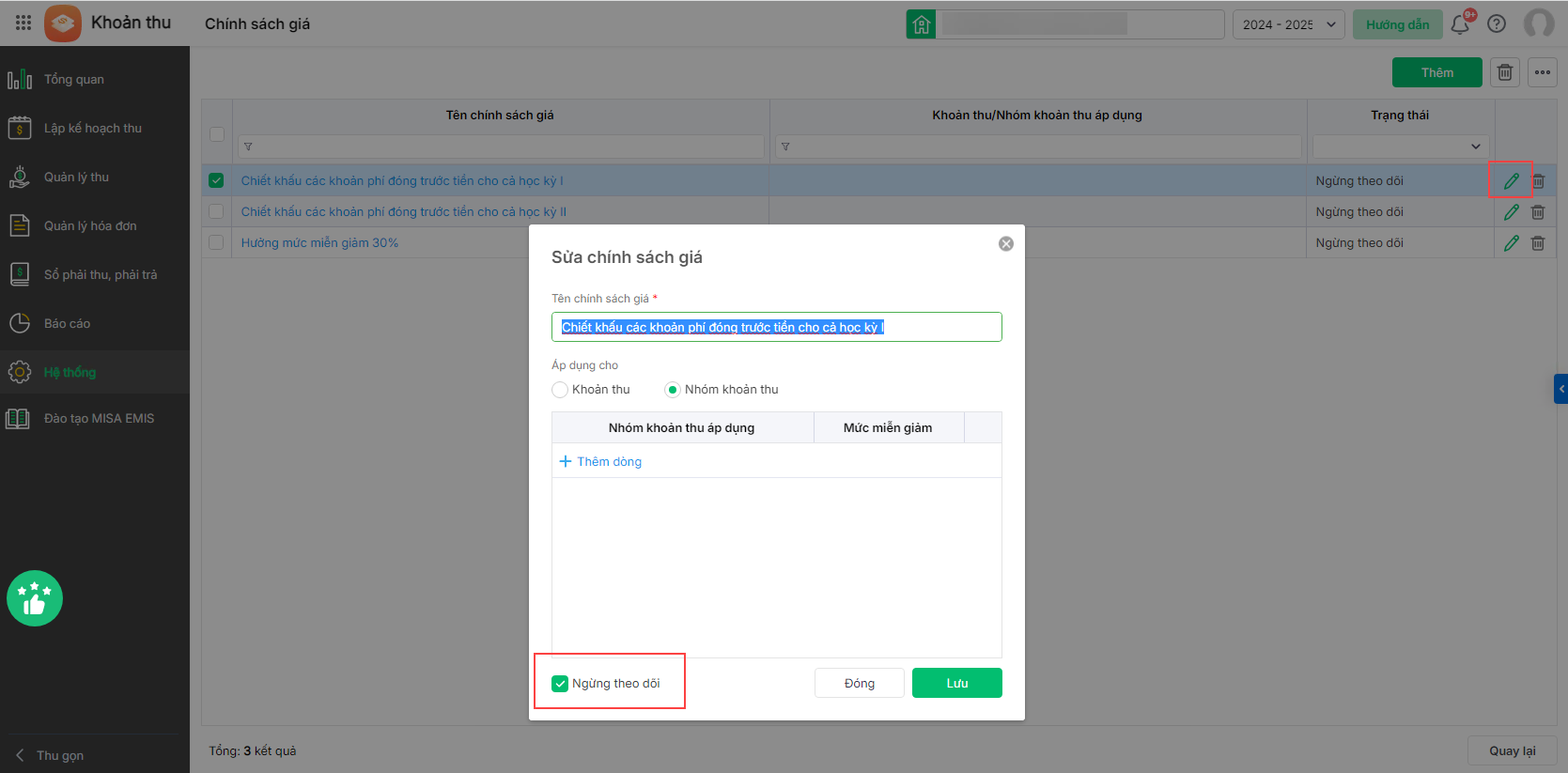 Lưu ý: Trường hợp nhà trường ngừng theo dõi diện ưu tiên thì tích chọn Ngừng theo dõi