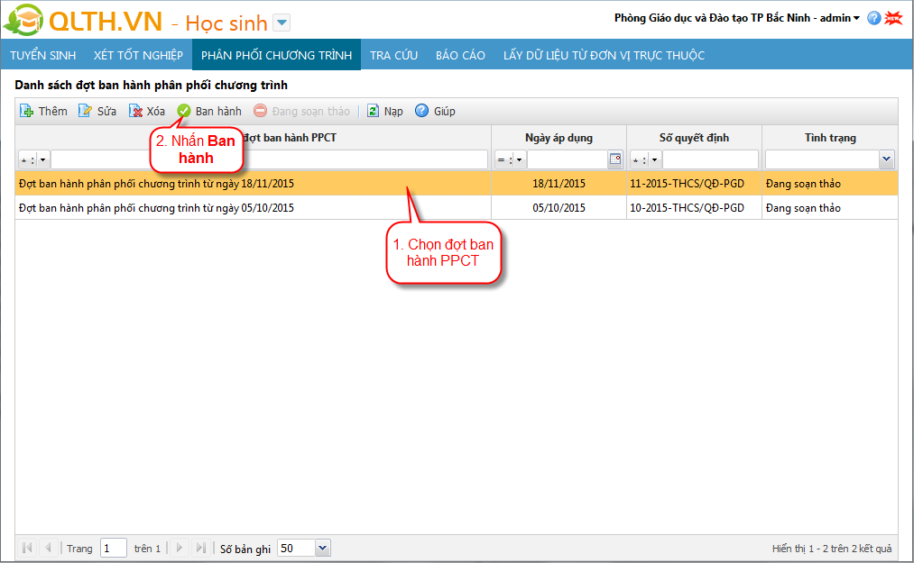 - Chọn menu Phân phối chương trình\Danh sách đợt Ban hành phân phối chương trình