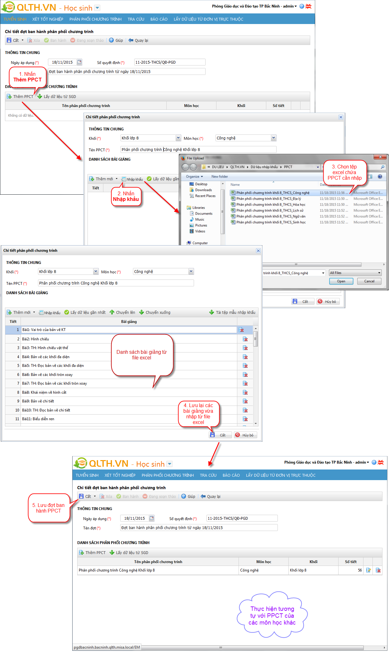 - Thực hiện nhập dữ liệu phân phối chương trình từ excel cho từng môn, từng khối