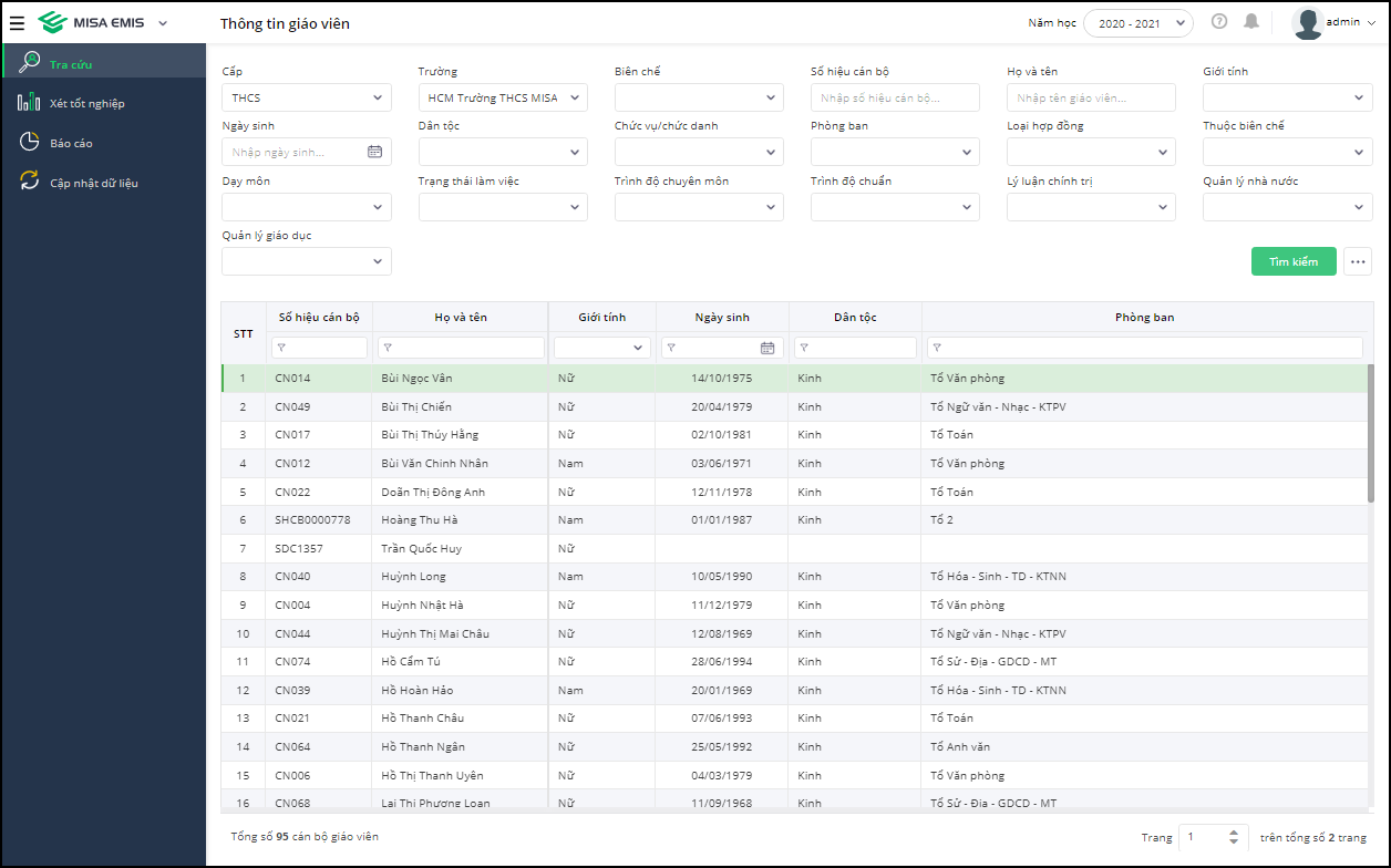 - Lựa chọn các thông tin cần tra cứu về giáo viên: Cấp, Trường, Biên chế, Họ và tên, Giới tính…